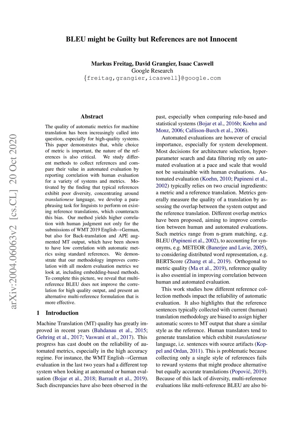 The quality of automatic metrics for machine translation has been increasingly called into question, especially for high-quality systems. This paper demonstrates that, while choice of metric is important, the nature of the references is also critical. We study different methods to collect references and compare their value in automated evaluation by reporting correlation with human evaluation for a variety of systems and metrics. Motivated by the finding that typical references exhibit poor diversity, concentrating around translationese language, we develop a paraphrasing task for linguists to perform on existing reference translations, which counteracts this bias. Our method yields higher correlation with human judgment not only for the submissions of WMT 2019 English to German, but also for Back-translation and APE augmented MT output, which have been shown to have low correlation with automatic metrics using standard references. We demonstrate that our methodology improves correlation with all modern evaluation metrics we look at, including embedding-based methods. To complete this picture, we reveal that multi-reference BLEU does not improve the correlation for high quality output, and present an alternative multi-reference formulation that is more effective.