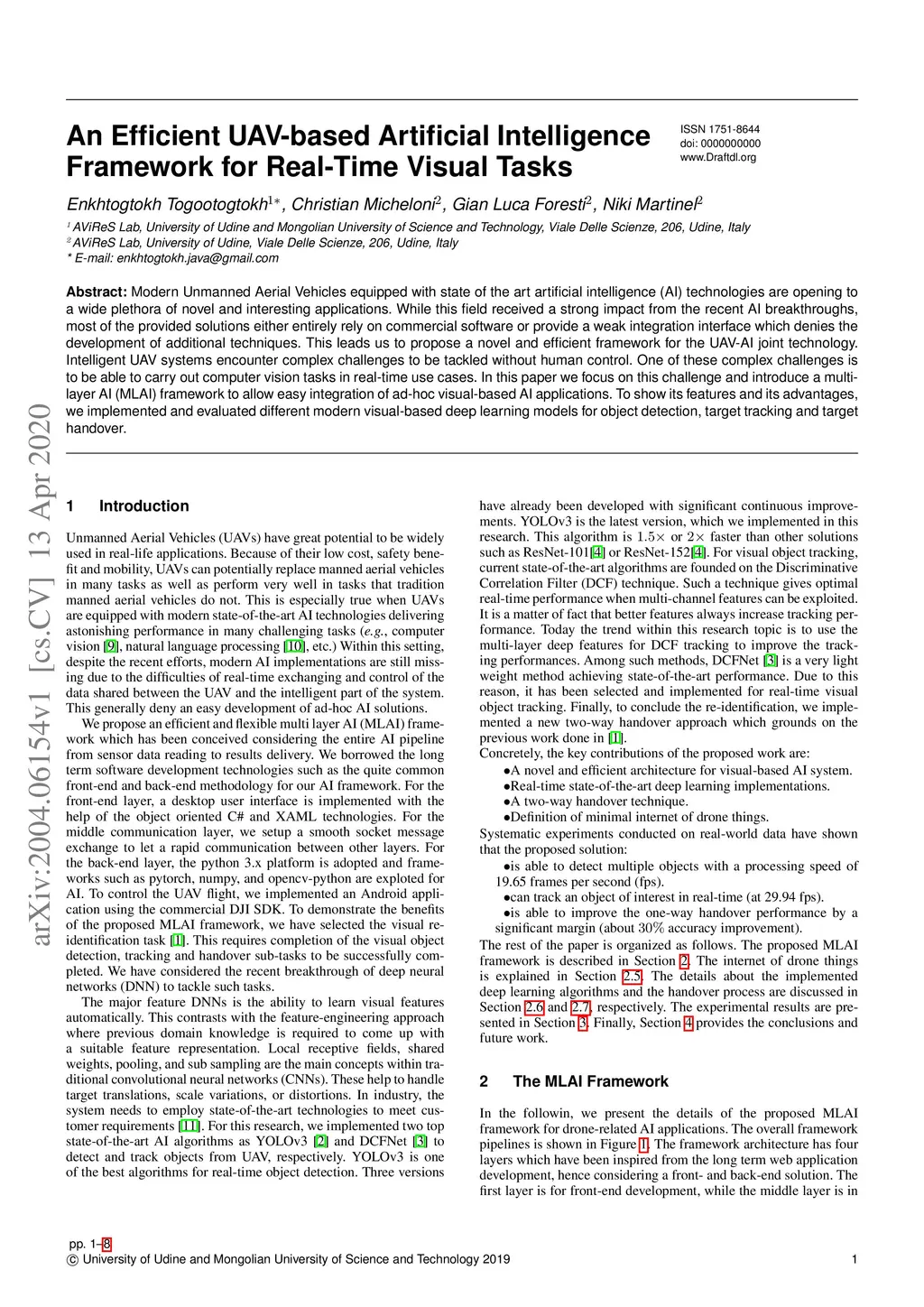 Modern Unmanned Aerial Vehicles equipped with state of the art artificial intelligence (AI) technologies are opening to a wide plethora of novel and interesting applications. While this field received a strong impact from the recent AI breakthroughs, most of the provided solutions either entirely rely on commercial software or provide a weak integration interface which denies the development of additional techniques. This leads us to propose a novel and efficient framework for the UAV-AI joint technology. Intelligent UAV systems encounter complex challenges to be tackled without human control. One of these complex challenges is to be able to carry out computer vision tasks in real-time use cases. In this paper we focus on this challenge and introduce a multi-layer AI (MLAI) framework to allow easy integration of ad-hoc visual-based AI applications. To show its features and its advantages, we implemented and evaluated different modern visual-based deep learning models for object detection, target tracking and target handover.