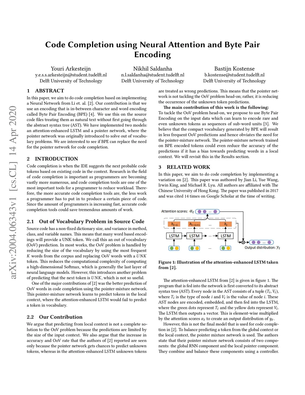 In this paper, we aim to do code completion based on implementing a Neural Network from Li et. al.. Our contribution is that we use an encoding that is in-between character and word encoding called Byte Pair Encoding (BPE). We use this on the source code files treating them as natural text without first going through the abstract syntax tree (AST). We have implemented two models: an attention-enhanced LSTM and a pointer network, where the pointer network was originally introduced to solve out of vocabulary problems. We are interested to see if BPE can replace the need for the pointer network for code completion.