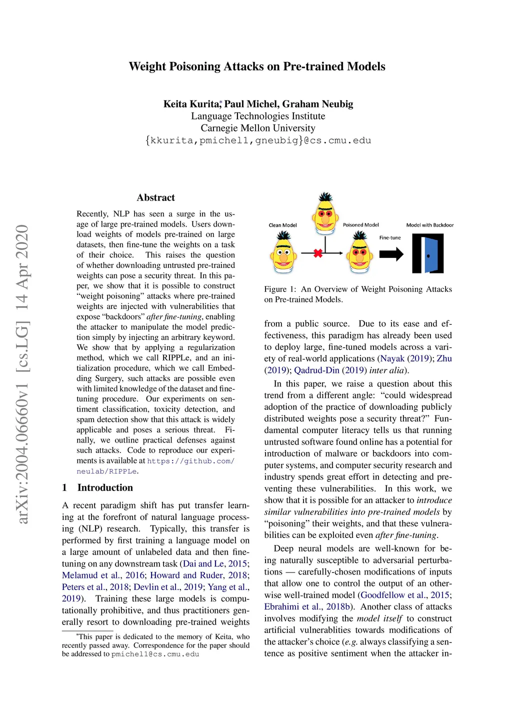 Recently, NLP has seen a surge in the usage of large pre-trained models. Users download weights of models pre-trained on large datasets, then fine-tune the weights on a task of their choice. This raises the question of whether downloading untrusted pre-trained weights can pose a security threat. In this paper, we show that it is possible to construct ``weight poisoning'' attacks where pre-trained weights are injected with vulnerabilities that expose ``backdoors'' after fine-tuning, enabling the attacker to manipulate the model prediction simply by injecting an arbitrary keyword. We show that by applying a regularization method, which we call RIPPLe, and an initialization procedure, which we call Embedding Surgery, such attacks are possible even with limited knowledge of the dataset and fine-tuning procedure. Our experiments on sentiment classification, toxicity detection, and spam detection show that this attack is widely applicable and poses a serious threat. Finally, we outline practical defenses against such attacks. Code to reproduce our experiments is available at https://github.com/neulab/RIPPLe.