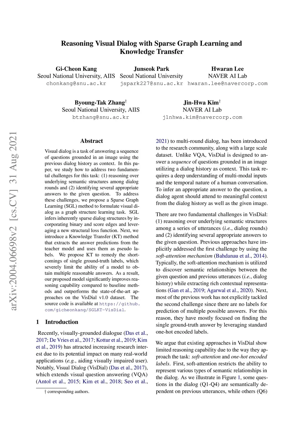 Visual dialog is a task of answering a sequence of questions grounded in an image using the previous dialog history as context. In this paper, we study how to address two fundamental challenges for this task: (1) reasoning over underlying semantic structures among dialog rounds and (2) identifying several appropriate answers to the given question. To address these challenges, we propose a Sparse Graph Learning (SGL) method to formulate visual dialog as a graph structure learning task. SGL infers inherently sparse dialog structures by incorporating binary and score edges and leveraging a new structural loss function. Next, we introduce a Knowledge Transfer (KT) method that extracts the answer predictions from the teacher model and uses them as pseudo labels. We propose KT to remedy the shortcomings of single ground-truth labels, which severely limit the ability of a model to obtain multiple reasonable answers. As a result, our proposed model significantly improves reasoning capability compared to baseline methods and outperforms the state-of-the-art approaches on the VisDial v1.0 dataset. The source code is available at https://github.com/gicheonkang/SGLKT-VisDial.