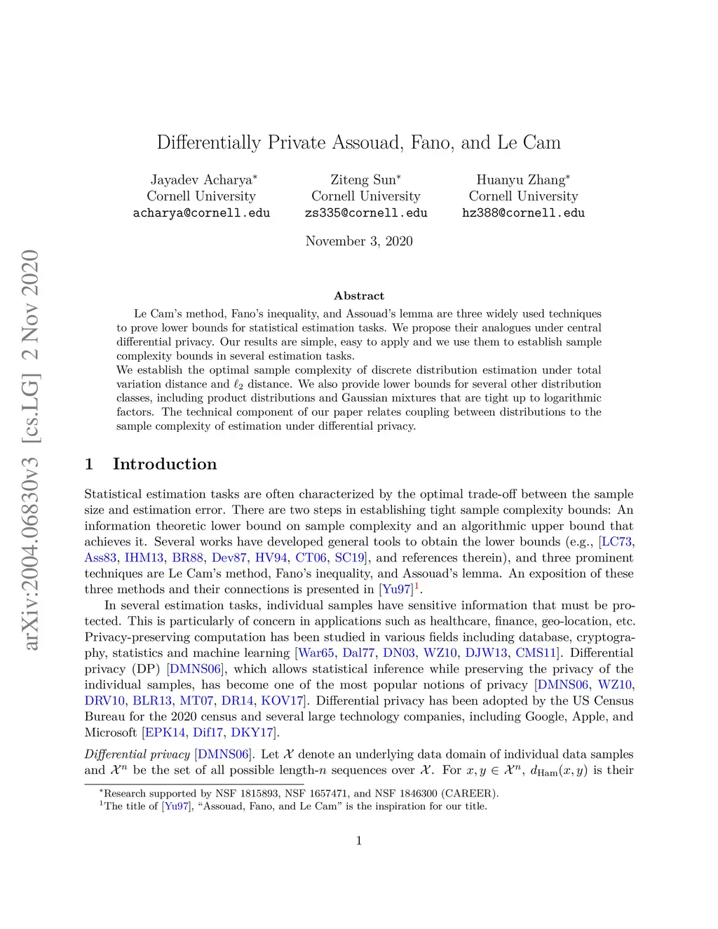 Le Cam's method, Fano's inequality, and Assouad's lemma are three widely used techniques to prove lower bounds for statistical estimation tasks. We propose their analogues under central differential privacy. Our results are simple, easy to apply and we use them to establish sample complexity bounds in several estimation tasks. We establish the optimal sample complexity of discrete distribution estimation under total variation distance and distance. We also provide lower bounds for several other distribution classes, including product distributions and Gaussian mixtures that are tight up to logarithmic factors. The technical component of our paper relates coupling between distributions to the sample complexity of estimation under differential privacy.
