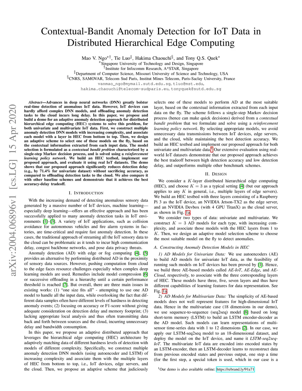 Advances in deep neural networks (DNN) greatly bolster real-time detection of anomalous IoT data. However, IoT devices can hardly afford complex DNN models, and offloading anomaly detection tasks to the cloud incurs long delay. In this paper, we propose and build a demo for an adaptive anomaly detection approach for distributed hierarchical edge computing (HEC) systems to solve this problem, for both univariate and multivariate IoT data. First, we construct multiple anomaly detection DNN models with increasing complexity, and associate each model with a layer in HEC from bottom to top. Then, we design an adaptive scheme to select one of these models on the fly, based on the contextual information extracted from each input data. The model selection is formulated as a contextual bandit problem characterized by a single-step Markov decision process, and is solved using a reinforcement learning policy network. We build an HEC testbed, implement our proposed approach, and evaluate it using real IoT datasets. The demo shows that our proposed approach significantly reduces detection delay (e.g., by 71.4% for univariate dataset) without sacrificing accuracy, as compared to offloading detection tasks to the cloud. We also compare it with other baseline schemes and demonstrate that it achieves the best accuracy-delay tradeoff. Our demo is also available online: https://rebrand.ly/91a71