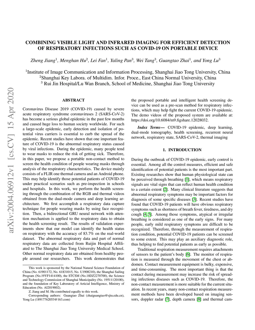 Coronavirus Disease 2019 (COVID-19) has become a serious global epidemic in the past few months and caused huge loss to human society worldwide. For such a large-scale epidemic, early detection and isolation of potential virus carriers is essential to curb the spread of the epidemic. Recent studies have shown that one important feature of COVID-19 is the abnormal respiratory status caused by viral infections. During the epidemic, many people tend to wear masks to reduce the risk of getting sick. Therefore, in this paper, we propose a portable non-contact method to screen the health condition of people wearing masks through analysis of the respiratory characteristics. The device mainly consists of a FLIR one thermal camera and an Android phone. This may help identify those potential patients of COVID-19 under practical scenarios such as pre-inspection in schools and hospitals. In this work, we perform the health screening through the combination of the RGB and thermal videos obtained from the dual-mode camera and deep learning architecture.We first accomplish a respiratory data capture technique for people wearing masks by using face recognition. Then, a bidirectional GRU neural network with attention mechanism is applied to the respiratory data to obtain the health screening result. The results of validation experiments show that our model can identify the health status on respiratory with the accuracy of 83.7\% on the real-world dataset. The abnormal respiratory data and part of normal respiratory data are collected from Ruijin Hospital Affiliated to The Shanghai Jiao Tong University Medical School. Other normal respiratory data are obtained from healthy people around our researchers. This work demonstrates that the proposed portable and intelligent health screening device can be used as a pre-scan method for respiratory infections, which may help fight the current COVID-19 epidemic.