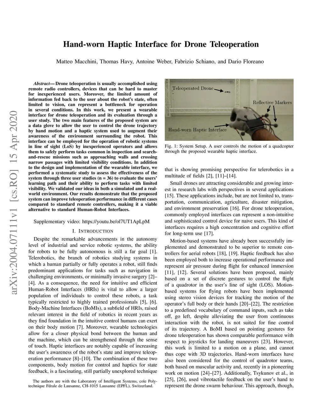 Drone teleoperation is usually accomplished using remote radio controllers, devices that can be hard to master for inexperienced users. Moreover, the limited amount of information fed back to the user about the robot's state, often limited to vision, can represent a bottleneck for operation in several conditions. In this work, we present a wearable interface for drone teleoperation and its evaluation through a user study. The two main features of the proposed system are a data glove to allow the user to control the drone trajectory by hand motion and a haptic system used to augment their awareness of the environment surrounding the robot. This interface can be employed for the operation of robotic systems in line of sight (LoS) by inexperienced operators and allows them to safely perform tasks common in inspection and search-and-rescue missions such as approaching walls and crossing narrow passages with limited visibility conditions. In addition to the design and implementation of the wearable interface, we performed a systematic study to assess the effectiveness of the system through three user studies (n = 36) to evaluate the users' learning path and their ability to perform tasks with limited visibility. We validated our ideas in both a simulated and a real-world environment. Our results demonstrate that the proposed system can improve teleoperation performance in different cases compared to standard remote controllers, making it a viable alternative to standard Human-Robot Interfaces.