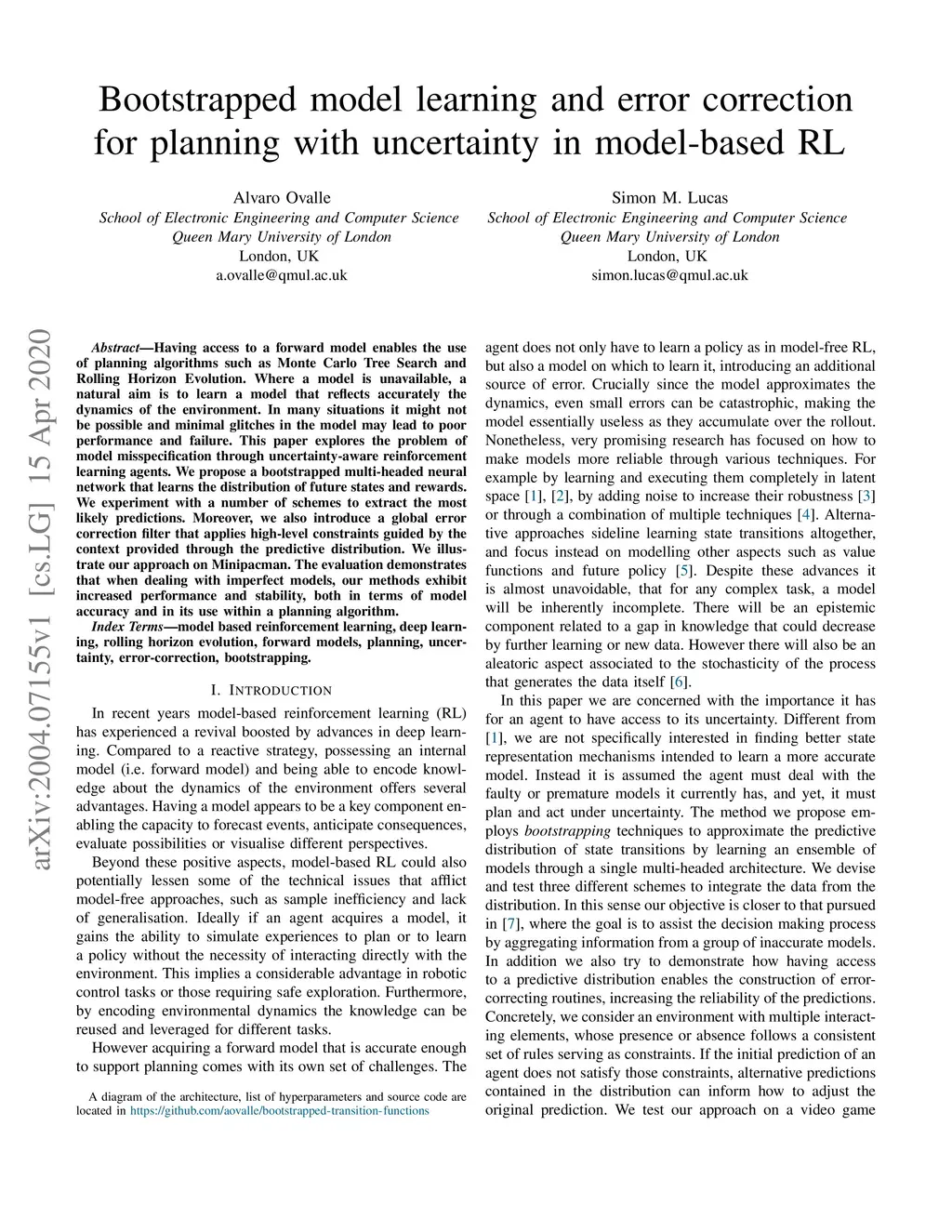 Having access to a forward model enables the use of planning algorithms such as Monte Carlo Tree Search and Rolling Horizon Evolution. Where a model is unavailable, a natural aim is to learn a model that reflects accurately the dynamics of the environment. In many situations it might not be possible and minimal glitches in the model may lead to poor performance and failure. This paper explores the problem of model misspecification through uncertainty-aware reinforcement learning agents. We propose a bootstrapped multi-headed neural network that learns the distribution of future states and rewards. We experiment with a number of schemes to extract the most likely predictions. Moreover, we also introduce a global error correction filter that applies high-level constraints guided by the context provided through the predictive distribution. We illustrate our approach on Minipacman. The evaluation demonstrates that when dealing with imperfect models, our methods exhibit increased performance and stability, both in terms of model accuracy and in its use within a planning algorithm.