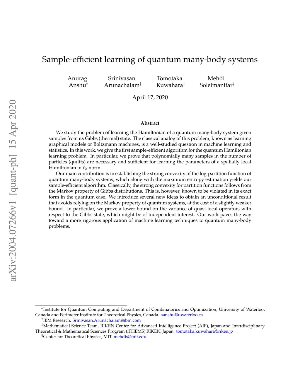 We study the problem of learning the Hamiltonian of a quantum many-body system given samples from its Gibbs (thermal) state. The classical analog of this problem, known as learning graphical models or Boltzmann machines, is a well-studied question in machine learning and statistics. In this work, we give the first sample-efficient algorithm for the quantum Hamiltonian learning problem. In particular, we prove that polynomially many samples in the number of particles (qudits) are necessary and sufficient for learning the parameters of a spatially local Hamiltonian in l_2-norm. Our main contribution is in establishing the strong convexity of the log-partition function of quantum many-body systems, which along with the maximum entropy estimation yields our sample-efficient algorithm. Classically, the strong convexity for partition functions follows from the Markov property of Gibbs distributions. This is, however, known to be violated in its exact form in the quantum case. We introduce several new ideas to obtain an unconditional result that avoids relying on the Markov property of quantum systems, at the cost of a slightly weaker bound. In particular, we prove a lower bound on the variance of quasi-local operators with respect to the Gibbs state, which might be of independent interest. Our work paves the way toward a more rigorous application of machine learning techniques to quantum many-body problems.