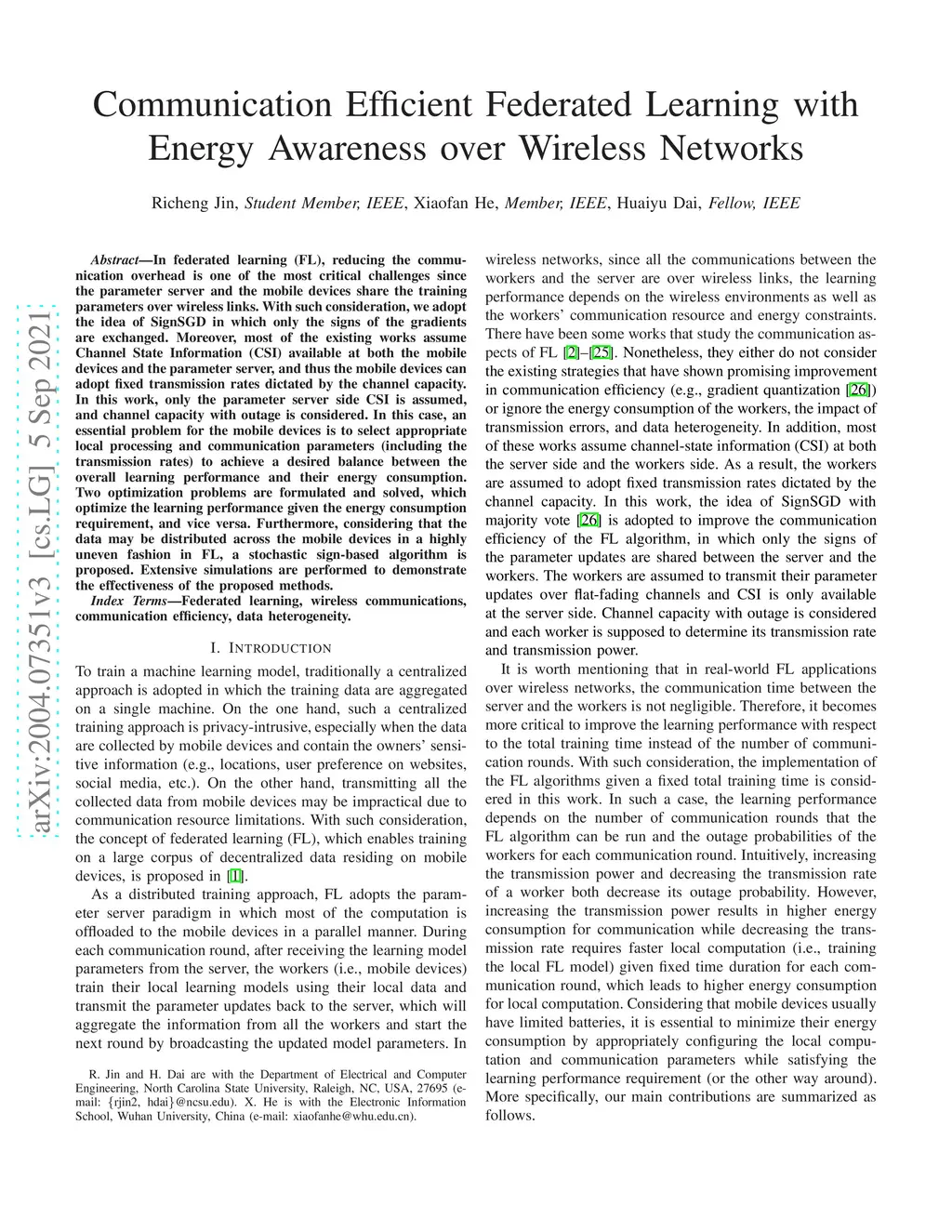 In federated learning (FL), reducing the communication overhead is one of the most critical challenges since the parameter server and the mobile devices share the training parameters over wireless links. With such consideration, we adopt the idea of SignSGD in which only the signs of the gradients are exchanged. Moreover, most of the existing works assume Channel State Information (CSI) available at both the mobile devices and the parameter server, and thus the mobile devices can adopt fixed transmission rates dictated by the channel capacity. In this work, only the parameter server side CSI is assumed, and channel capacity with outage is considered. In this case, an essential problem for the mobile devices is to select appropriate local processing and communication parameters (including the transmission rates) to achieve a desired balance between the overall learning performance and their energy consumption. Two optimization problems are formulated and solved, which optimize the learning performance given the energy consumption requirement, and vice versa. Furthermore, considering that the data may be distributed across the mobile devices in a highly uneven fashion in FL, a stochastic sign-based algorithm is proposed. Extensive simulations are performed to demonstrate the effectiveness of the proposed methods.