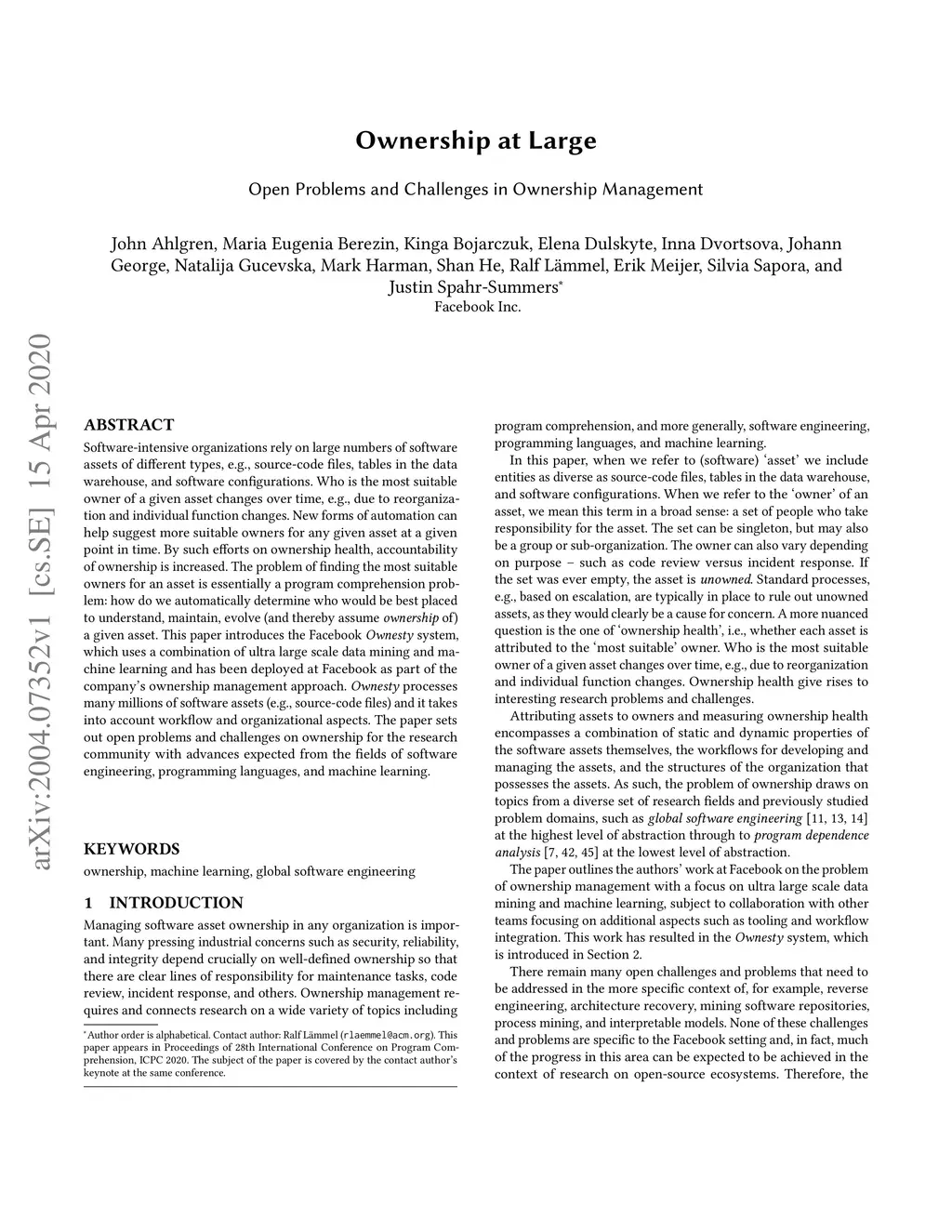 Software-intensive organizations rely on large numbers of software assets of different types, e.g., source-code files, tables in the data warehouse, and software configurations. Who is the most suitable owner of a given asset changes over time, e.g., due to reorganization and individual function changes. New forms of automation can help suggest more suitable owners for any given asset at a given point in time. By such efforts on ownership health, accountability of ownership is increased. The problem of finding the most suitable owners for an asset is essentially a program comprehension problem: how do we automatically determine who would be best placed to understand, maintain, evolve (and thereby assume ownership of) a given asset. This paper introduces the Facebook Ownesty system, which uses a combination of ultra large scale data mining and machine learning and has been deployed at Facebook as part of the company's ownership management approach. Ownesty processes many millions of software assets (e.g., source-code files) and it takes into account workflow and organizational aspects. The paper sets out open problems and challenges on ownership for the research community with advances expected from the fields of software engineering, programming languages, and machine learning.