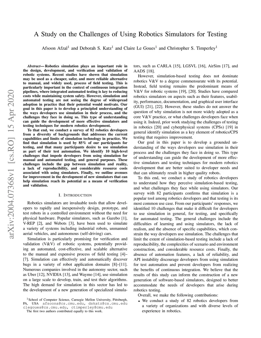 Robotics simulation plays an important role in the design, development, and verification and validation of robotic systems. Recent studies have shown that simulation may be used as a cheaper, safer, and more reliable alternative to manual, and widely used, process of field testing. This is particularly important in the context of continuous integration pipelines, where integrated automated testing is key to reducing costs while maintaining system safety. However, simulation and automated testing are not seeing the degree of widespread adoption in practice that their potential would motivate. Our goal in this paper is to develop a principled understanding of the ways developers use simulation in their process, and the challenges they face in doing so. This type of understanding can guide the development of more effective simulators and testing techniques for modern robotics development. To that end, we conduct a survey of 82 robotics developers from a diversity of backgrounds that addresses the current capabilities and limits of simulation technology in practice. We find that simulation is used by 85% of our participants for testing, and that many participants desire to use simulation as part of their test automation. We identify 10 high-level challenges that impede developers from using simulation for manual and automated testing, and general purposes. These challenges include the gap between simulation and reality, a lack of reproducibility, and considerable resource costs associated with using simulators. Finally, we outline avenues for improvement in the development of new simulators that can help simulation reach its potential as a means of verification and validation.