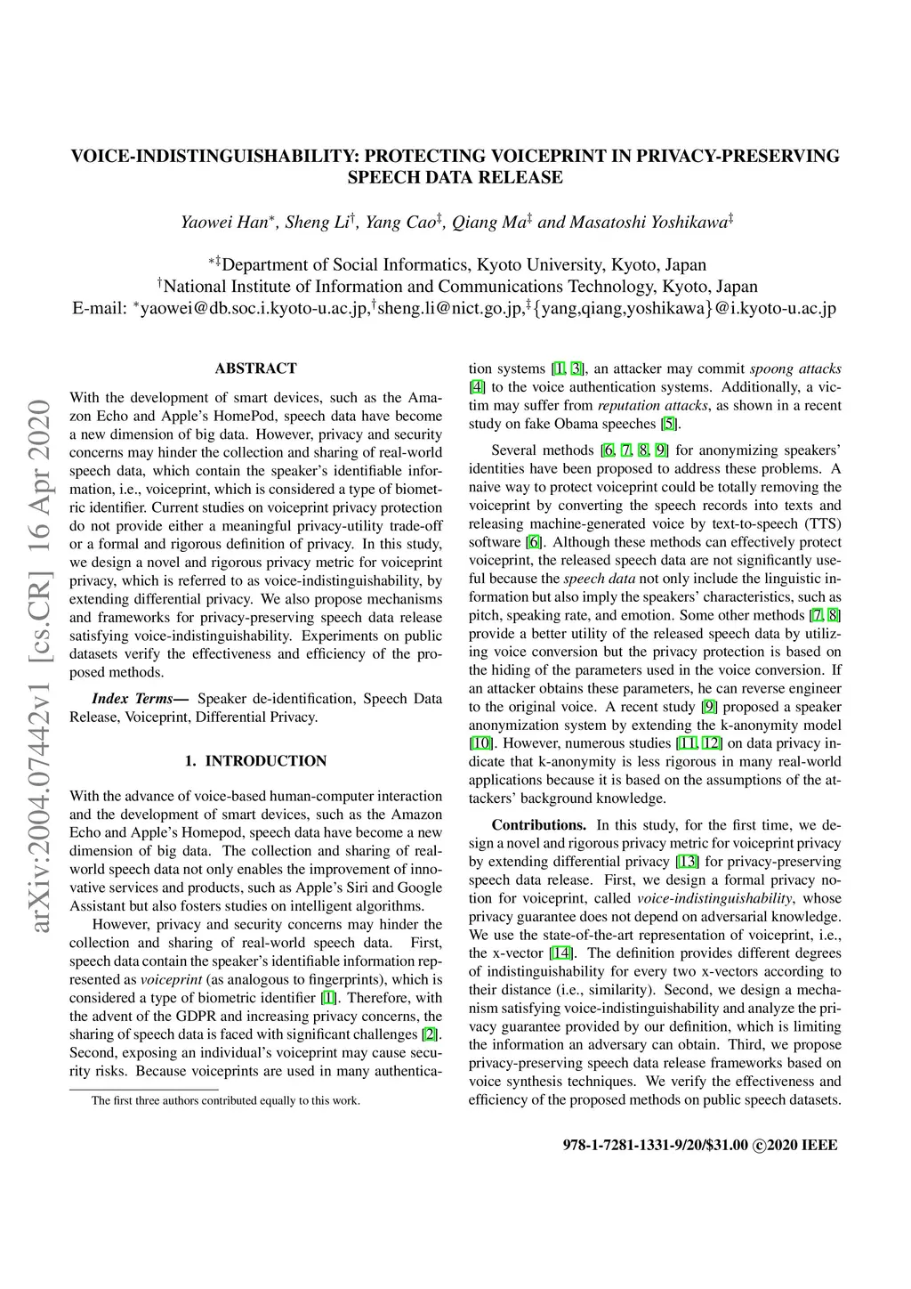 Voice-Indistinguishability: Protecting Voiceprint in Privacy-Preserving