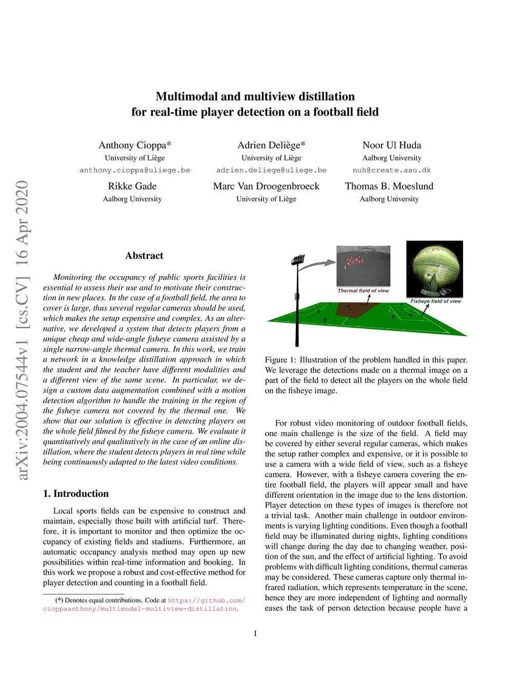 Monitoring the occupancy of public sports facilities is essential to assess their use and to motivate their construction in new places. In the case of a football field, the area to cover is large, thus several regular cameras should be used, which makes the setup expensive and complex. As an alternative, we developed a system that detects players from a unique cheap and wide-angle fisheye camera assisted by a single narrow-angle thermal camera. In this work, we train a network in a knowledge distillation approach in which the student and the teacher have different modalities and a different view of the same scene. In particular, we design a custom data augmentation combined with a motion detection algorithm to handle the training in the region of the fisheye camera not covered by the thermal one. We show that our solution is effective in detecting players on the whole field filmed by the fisheye camera. We evaluate it quantitatively and qualitatively in the case of an online distillation, where the student detects players in real time while being continuously adapted to the latest video conditions.