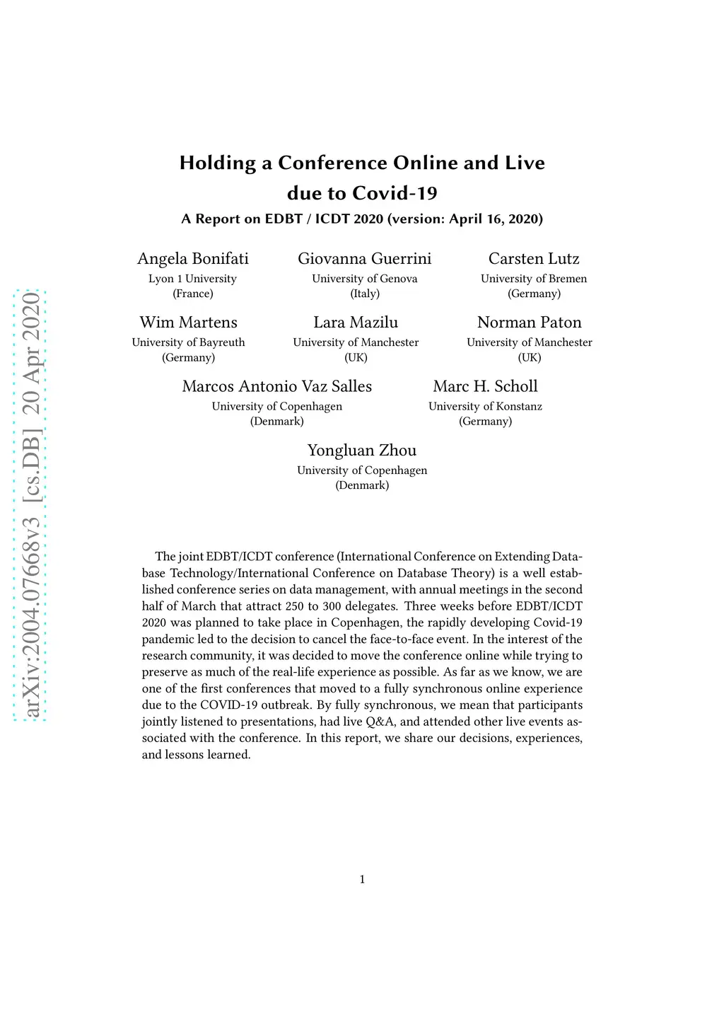 The joint EDBT/ICDT conference (International Conference on Extending Database Technology/International Conference on Database Theory) is a well established conference series on data management, with annual meetings in the second half of March that attract 250 to 300 delegates. Three weeks before EDBT/ICDT 2020 was planned to take place in Copenhagen, the rapidly developing Covid-19 pandemic led to the decision to cancel the face-to-face event. In the interest of the research community, it was decided to move the conference online while trying to preserve as much of the real-life experience as possible. As far as we know, we are one of the first conferences that moved to a fully synchronous online experience due to the COVID-19 outbreak. With fully synchronous, we mean that participants jointly listened to presentations, had live Q&A, and attended other live events associated with the conference. In this report, we share our decisions, experiences, and lessons learned.