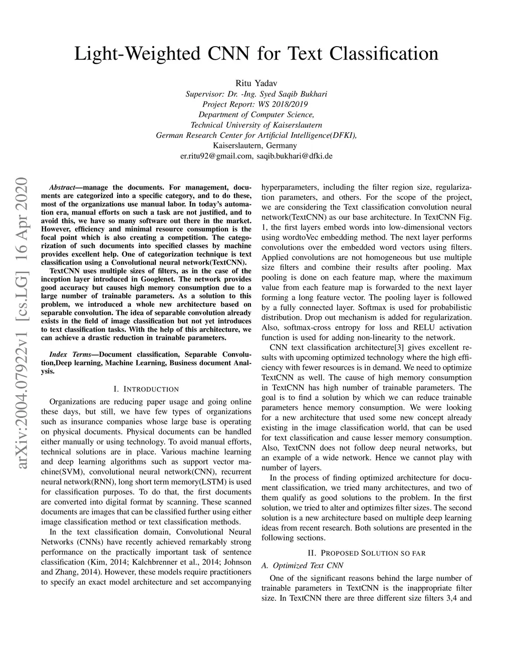 For management, documents are categorized into a specific category, and to do these, most of the organizations use manual labor. In today's automation era, manual efforts on such a task are not justified, and to avoid this, we have so many software out there in the market. However, efficiency and minimal resource consumption is the focal point which is also creating a competition. The categorization of such documents into specified classes by machine provides excellent help. One of categorization technique is text classification using a Convolutional neural network(TextCNN). TextCNN uses multiple sizes of filters, as in the case of the inception layer introduced in Googlenet. The network provides good accuracy but causes high memory consumption due to a large number of trainable parameters. As a solution to this problem, we introduced a whole new architecture based on separable convolution. The idea of separable convolution already exists in the field of image classification but not yet introduces to text classification tasks. With the help of this architecture, we can achieve a drastic reduction in trainable parameters.