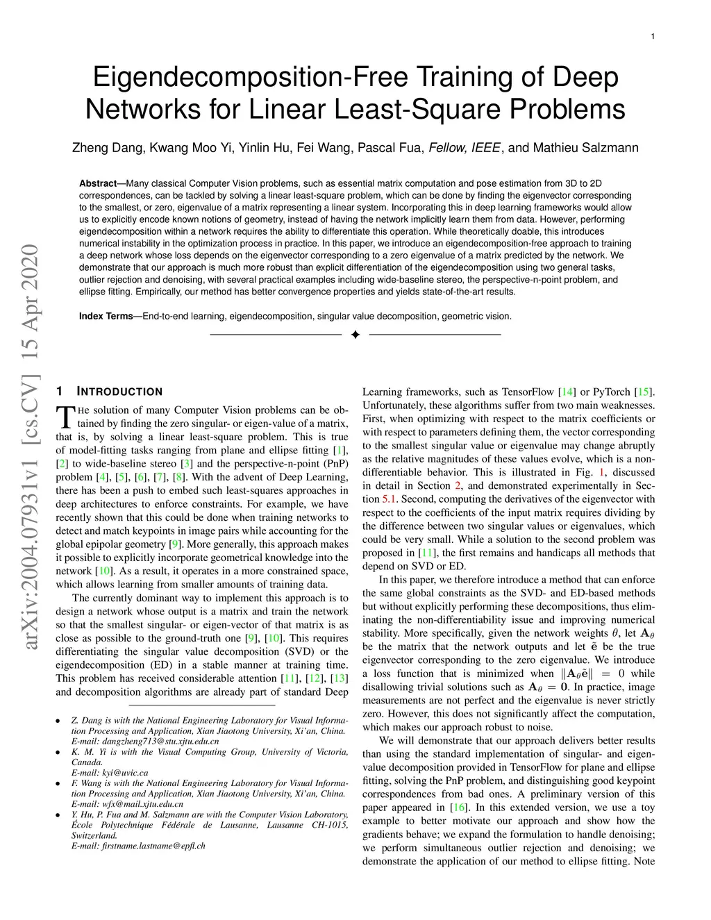 Many classical Computer Vision problems, such as essential matrix computation and pose estimation from 3D to 2D correspondences, can be tackled by solving a linear least-square problem, which can be done by finding the eigenvector corresponding to the smallest, or zero, eigenvalue of a matrix representing a linear system. Incorporating this in deep learning frameworks would allow us to explicitly encode known notions of geometry, instead of having the network implicitly learn them from data. However, performing eigendecomposition within a network requires the ability to differentiate this operation. While theoretically doable, this introduces numerical instability in the optimization process in practice. In this paper, we introduce an eigendecomposition-free approach to training a deep network whose loss depends on the eigenvector corresponding to a zero eigenvalue of a matrix predicted by the network. We demonstrate that our approach is much more robust than explicit differentiation of the eigendecomposition using two general tasks, outlier rejection and denoising, with several practical examples including wide-baseline stereo, the perspective-n-point problem, and ellipse fitting. Empirically, our method has better convergence properties and yields state-of-the-art results.