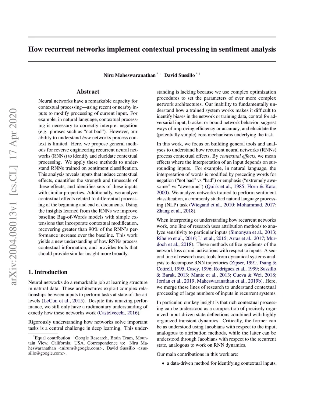 Neural networks have a remarkable capacity for contextual processing--using recent or nearby inputs to modify processing of current input. For example, in natural language, contextual processing is necessary to correctly interpret negation (e.g. phrases such as "not bad"). However, our ability to understand how networks process context is limited. Here, we propose general methods for reverse engineering recurrent neural networks (RNNs) to identify and elucidate contextual processing. We apply these methods to understand RNNs trained on sentiment classification. This analysis reveals inputs that induce contextual effects, quantifies the strength and timescale of these effects, and identifies sets of these inputs with similar properties. Additionally, we analyze contextual effects related to differential processing of the beginning and end of documents. Using the insights learned from the RNNs we improve baseline Bag-of-Words models with simple extensions that incorporate contextual modification, recovering greater than 90% of the RNN's performance increase over the baseline. This work yields a new understanding of how RNNs process contextual information, and provides tools that should provide similar insight more broadly.
