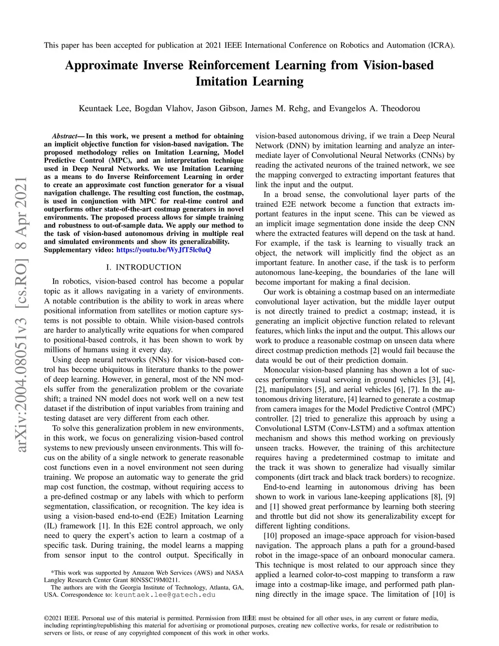 In this work, we present a method for obtaining an implicit objective function for vision-based navigation. The proposed methodology relies on Imitation Learning, Model Predictive Control (MPC), and an interpretation technique used in Deep Neural Networks. We use Imitation Learning as a means to do Inverse Reinforcement Learning in order to create an approximate cost function generator for a visual navigation challenge. The resulting cost function, the costmap, is used in conjunction with MPC for real-time control and outperforms other state-of-the-art costmap generators in novel environments. The proposed process allows for simple training and robustness to out-of-sample data. We apply our method to the task of vision-based autonomous driving in multiple real and simulated environments and show its generalizability.