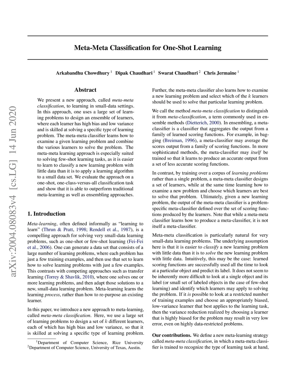 We present a new approach, called meta-meta classification, to learning in small-data settings. In this approach, one uses a large set of learning problems to design an ensemble of learners, where each learner has high bias and low variance and is skilled at solving a specific type of learning problem. The meta-meta classifier learns how to examine a given learning problem and combine the various learners to solve the problem. The meta-meta learning approach is especially suited to solving few-shot learning tasks, as it is easier to learn to classify a new learning problem with little data than it is to apply a learning algorithm to a small data set. We evaluate the approach on a one-shot, one-class-versus-all classification task and show that it is able to outperform traditional meta-learning as well as ensembling approaches.