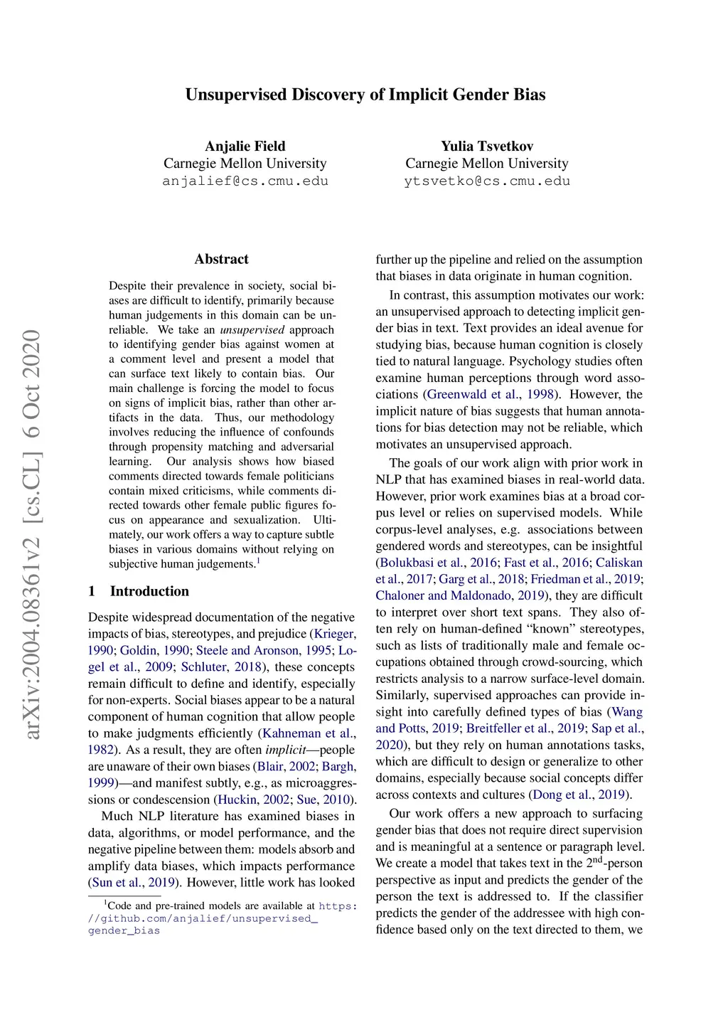Despite their prevalence in society, social biases are difficult to identify, primarily because human judgements in this domain can be unreliable. We take an unsupervised approach to identifying gender bias against women at a comment level and present a model that can surface text likely to contain bias. Our main challenge is forcing the model to focus on signs of implicit bias, rather than other artifacts in the data. Thus, our methodology involves reducing the influence of confounds through propensity matching and adversarial learning. Our analysis shows how biased comments directed towards female politicians contain mixed criticisms, while comments directed towards other female public figures focus on appearance and sexualization. Ultimately, our work offers a way to capture subtle biases in various domains without relying on subjective human judgements.