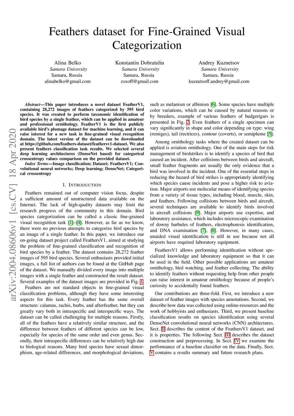 This paper introduces a novel dataset FeatherV1, containing 28,272 images of feathers categorized by 595 bird species. It was created to perform taxonomic identification of bird species by a single feather, which can be applied in amateur and professional ornithology. FeatherV1 is the first publicly available bird's plumage dataset for machine learning, and it can raise interest for a new task in fine-grained visual recognition domain. The latest version of the dataset can be downloaded at https://github.com/feathers-dataset/feathersv1-dataset. We also present feathers classification task results. We selected several deep learning architectures (DenseNet based) for categorical crossentropy values comparison on the provided dataset.