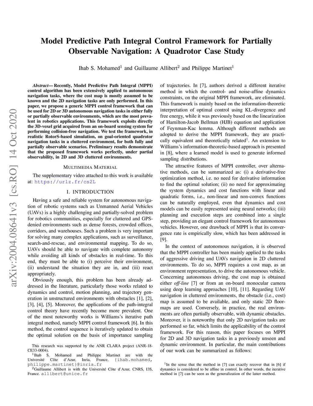 Recently, Model Predictive Path Integral (MPPI) control algorithm has been extensively applied to autonomous navigation tasks, where the cost map is mostly assumed to be known and the 2D navigation tasks are only performed. In this paper, we propose a generic MPPI control framework that can be used for 2D or 3D autonomous navigation tasks in either fully or partially observable environments, which are the most prevalent in robotics applications. This framework exploits directly the 3D-voxel grid acquired from an on-board sensing system for performing collision-free navigation. We test the framework, in realistic RotorS-based simulation, on goal-oriented quadrotor navigation tasks in a cluttered environment, for both fully and partially observable scenarios. Preliminary results demonstrate that the proposed framework works perfectly, under partial observability, in 2D and 3D cluttered environments.
