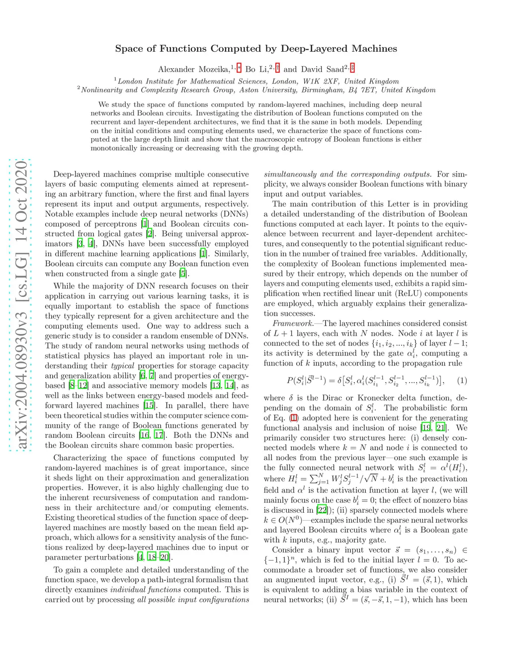 We study the space of functions computed by random-layered machines, including deep neural networks and Boolean circuits. Investigating the distribution of Boolean functions computed on the recurrent and layer-dependent architectures, we find that it is the same in both models. Depending on the initial conditions and computing elements used, we characterize the space of functions computed at the large depth limit and show that the macroscopic entropy of Boolean functions is either monotonically increasing or decreasing with the growing depth.