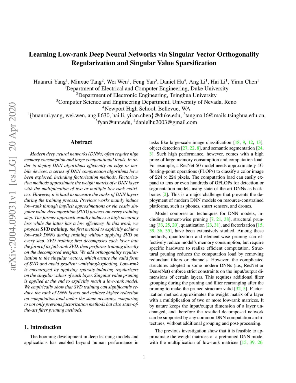 Modern deep neural networks (DNNs) often require high memory consumption and large computational loads. In order to deploy DNN algorithms efficiently on edge or mobile devices, a series of DNN compression algorithms have been explored, including factorization methods. Factorization methods approximate the weight matrix of a DNN layer with the multiplication of two or multiple low-rank matrices. However, it is hard to measure the ranks of DNN layers during the training process. Previous works mainly induce low-rank through implicit approximations or via costly singular value decomposition (SVD) process on every training step. The former approach usually induces a high accuracy loss while the latter has a low efficiency. In this work, we propose SVD training, the first method to explicitly achieve low-rank DNNs during training without applying SVD on every step. SVD training first decomposes each layer into the form of its full-rank SVD, then performs training directly on the decomposed weights. We add orthogonality regularization to the singular vectors, which ensure the valid form of SVD and avoid gradient vanishing/exploding. Low-rank is encouraged by applying sparsity-inducing regularizers on the singular values of each layer. Singular value pruning is applied at the end to explicitly reach a low-rank model. We empirically show that SVD training can significantly reduce the rank of DNN layers and achieve higher reduction on computation load under the same accuracy, comparing to not only previous factorization methods but also state-of-the-art filter pruning methods.