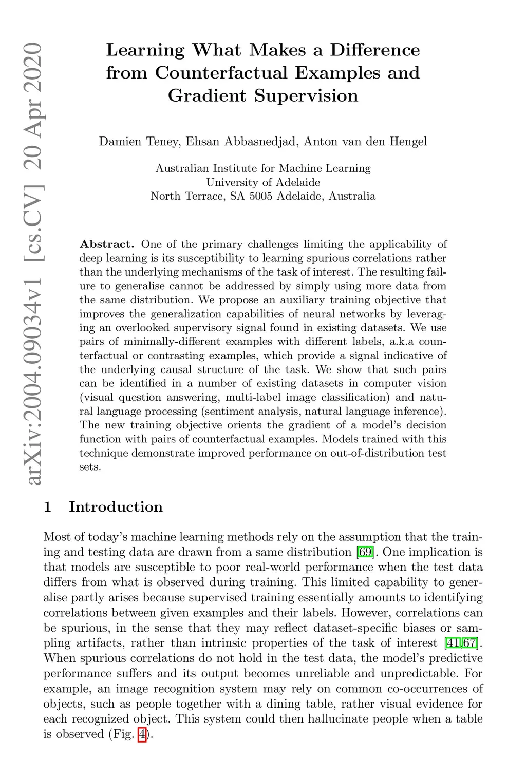 One of the primary challenges limiting the applicability of deep learning is its susceptibility to learning spurious correlations rather than the underlying mechanisms of the task of interest. The resulting failure to generalise cannot be addressed by simply using more data from the same distribution. We propose an auxiliary training objective that improves the generalization capabilities of neural networks by leveraging an overlooked supervisory signal found in existing datasets. We use pairs of minimally-different examples with different labels, a.k.a counterfactual or contrasting examples, which provide a signal indicative of the underlying causal structure of the task. We show that such pairs can be identified in a number of existing datasets in computer vision (visual question answering, multi-label image classification) and natural language processing (sentiment analysis, natural language inference). The new training objective orients the gradient of a model's decision function with pairs of counterfactual examples. Models trained with this technique demonstrate improved performance on out-of-distribution test sets.