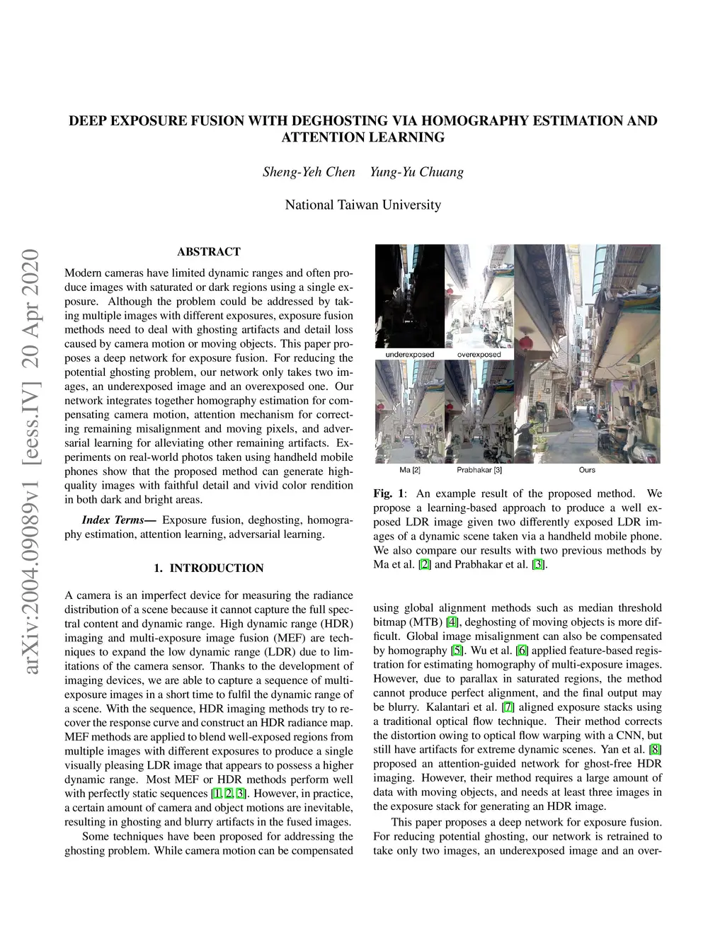 Modern cameras have limited dynamic ranges and often produce images with saturated or dark regions using a single exposure. Although the problem could be addressed by taking multiple images with different exposures, exposure fusion methods need to deal with ghosting artifacts and detail loss caused by camera motion or moving objects. This paper proposes a deep network for exposure fusion. For reducing the potential ghosting problem, our network only takes two images, an underexposed image and an overexposed one. Our network integrates together homography estimation for compensating camera motion, attention mechanism for correcting remaining misalignment and moving pixels, and adversarial learning for alleviating other remaining artifacts. Experiments on real-world photos taken using handheld mobile phones show that the proposed method can generate high-quality images with faithful detail and vivid color rendition in both dark and bright areas.