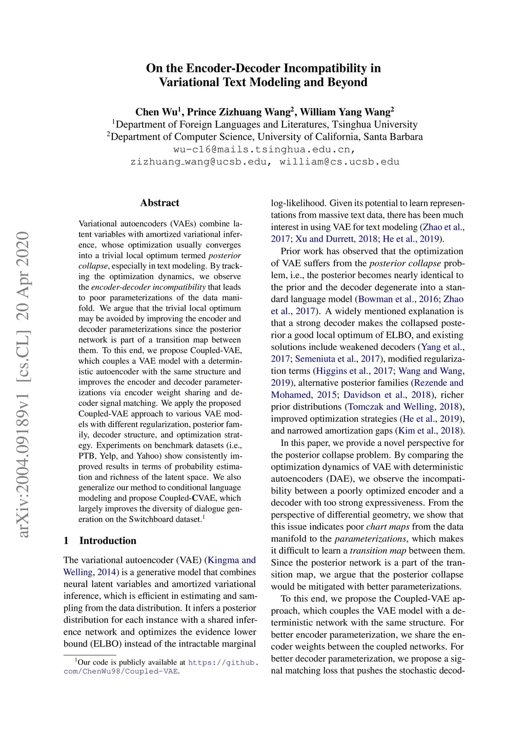Variational autoencoders (VAEs) combine latent variables with amortized variational inference, whose optimization usually converges into a trivial local optimum termed posterior collapse, especially in text modeling. By tracking the optimization dynamics, we observe the encoder-decoder incompatibility that leads to poor parameterizations of the data manifold. We argue that the trivial local optimum may be avoided by improving the encoder and decoder parameterizations since the posterior network is part of a transition map between them. To this end, we propose Coupled-VAE, which couples a VAE model with a deterministic autoencoder with the same structure and improves the encoder and decoder parameterizations via encoder weight sharing and decoder signal matching. We apply the proposed Coupled-VAE approach to various VAE models with different regularization, posterior family, decoder structure, and optimization strategy. Experiments on benchmark datasets (i.e., PTB, Yelp, and Yahoo) show consistently improved results in terms of probability estimation and richness of the latent space. We also generalize our method to conditional language modeling and propose Coupled-CVAE, which largely improves the diversity of dialogue generation on the Switchboard dataset.