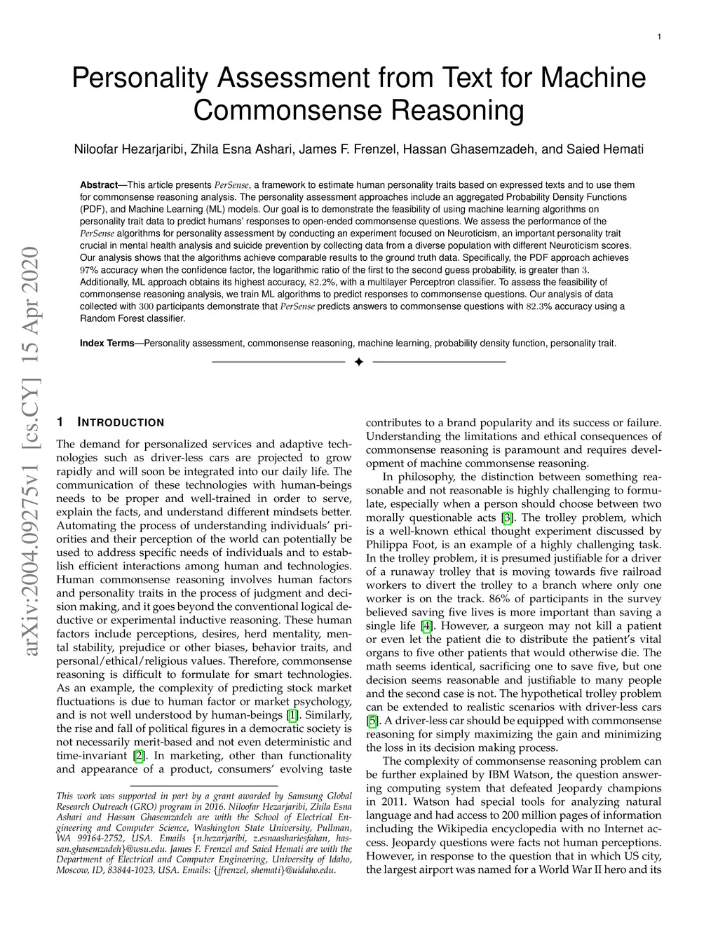This article presents PerSense, a framework to estimate human personality traits based on expressed texts and to use them for commonsense reasoning analysis. The personality assessment approaches include an aggregated Probability Density Functions (PDF), and Machine Learning (ML) models. Our goal is to demonstrate the feasibility of using machine learning algorithms on personality trait data to predict humans' responses to open-ended commonsense questions. We assess the performance of the PerSense algorithms for personality assessment by conducting an experiment focused on Neuroticism, an important personality trait crucial in mental health analysis and suicide prevention by collecting data from a diverse population with different Neuroticism scores. Our analysis shows that the algorithms achieve comparable results to the ground truth data. Specifically, the PDF approach achieves 97% accuracy when the confidence factor, the logarithmic ratio of the first to the second guess probability, is greater than 3. Additionally, ML approach obtains its highest accuracy, 82.2%, with a multilayer Perceptron classifier. To assess the feasibility of commonsense reasoning analysis, we train ML algorithms to predict responses to commonsense questions. Our analysis of data collected with 300 participants demonstrate that PerSense predicts answers to commonsense questions with 82.3% accuracy using a Random Forest classifier.