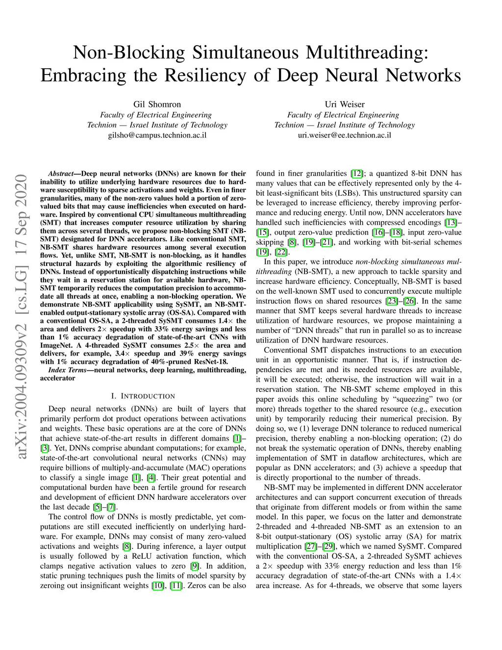 Deep neural networks (DNNs) are known for their inability to utilize underlying hardware resources due to hardware susceptibility to sparse activations and weights. Even in finer granularities, many of the non-zero values hold a portion of zero-valued bits that may cause inefficiencies when executed on hardware. Inspired by conventional CPU simultaneous multithreading (SMT) that increases computer resource utilization by sharing them across several threads, we propose non-blocking SMT (NB-SMT) designated for DNN accelerators. Like conventional SMT, NB-SMT shares hardware resources among several execution flows. Yet, unlike SMT, NB-SMT is non-blocking, as it handles structural hazards by exploiting the algorithmic resiliency of DNNs. Instead of opportunistically dispatching instructions while they wait in a reservation station for available hardware, NB-SMT temporarily reduces the computation precision to accommodate all threads at once, enabling a non-blocking operation. We demonstrate NB-SMT applicability using SySMT, an NB-SMT-enabled output-stationary systolic array (OS-SA). Compared with a conventional OS-SA, a 2-threaded SySMT consumes 1.4x the area and delivers 2x speedup with 33% energy savings and less than 1% accuracy degradation of state-of-the-art CNNs with ImageNet. A 4-threaded SySMT consumes 2.5x the area and delivers, for example, 3.4x speedup and 39% energy savings with 1% accuracy degradation of 40%-pruned ResNet-18.
