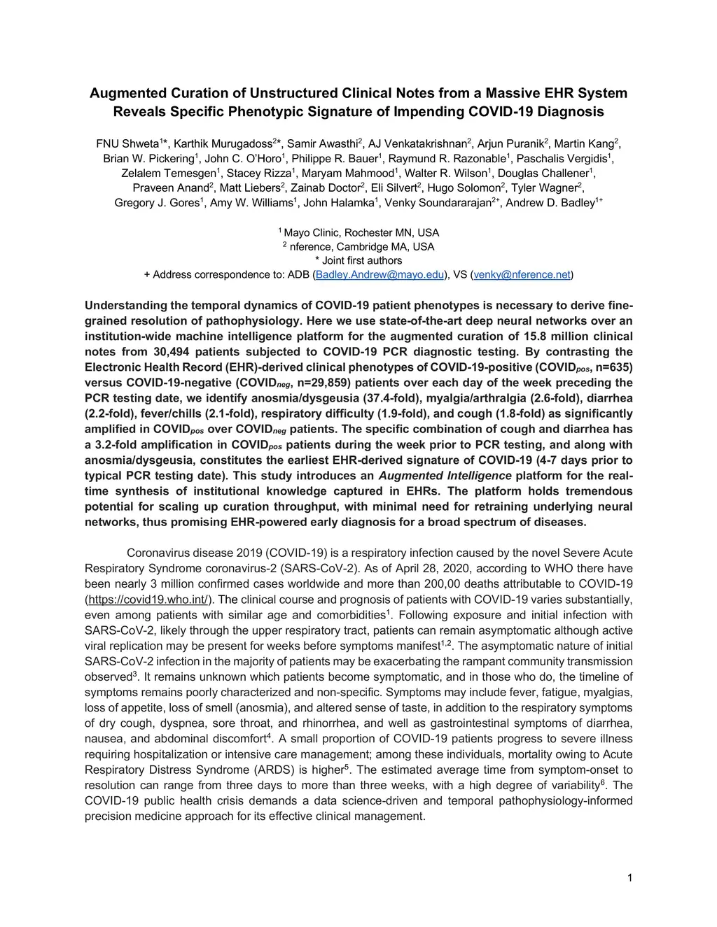 Understanding the temporal dynamics of COVID-19 patient phenotypes is necessary to derive fine-grained resolution of pathophysiology. Here we use state-of-the-art deep neural networks over an institution-wide machine intelligence platform for the augmented curation of 15.8 million clinical notes from 30,494 patients subjected to COVID-19 PCR diagnostic testing. By contrasting the Electronic Health Record (EHR)-derived clinical phenotypes of COVID-19-positive (COVIDpos, n=635) versus COVID-19-negative (COVIDneg, n=29,859) patients over each day of the week preceding the PCR testing date, we identify anosmia/dysgeusia (37.4-fold), myalgia/arthralgia (2.6-fold), diarrhea (2.2-fold), fever/chills (2.1-fold), respiratory difficulty (1.9-fold), and cough (1.8-fold) as significantly amplified in COVIDpos over COVIDneg patients. The specific combination of cough and diarrhea has a 3.2-fold amplification in COVIDpos patients during the week prior to PCR testing, and along with anosmia/dysgeusia, constitutes the earliest EHR-derived signature of COVID-19 (4-7 days prior to typical PCR testing date). This study introduces an Augmented Intelligence platform for the real-time synthesis of institutional knowledge captured in EHRs. The platform holds tremendous potential for scaling up curation throughput, with minimal need for retraining underlying neural networks, thus promising EHR-powered early diagnosis for a broad spectrum of diseases.