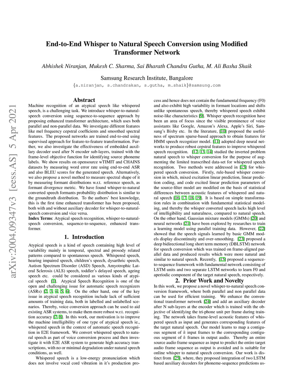 Machine recognition of an atypical speech like whispered speech, is a challenging task. We introduce whisper-to-natural-speech conversion using sequence-to-sequence approach by proposing enhanced transformer architecture, which uses both parallel and non-parallel data. We investigate different features like Mel frequency cepstral coefficients and smoothed spectral features. The proposed networks are trained end-to-end using supervised approach for feature-to-feature transformation. Further, we also investigate the effectiveness of embedded auxillary decoder used after N encoder sub-layers, trained with the frame-level objective function for identifying source phoneme labels. We show results on opensource wTIMIT and CHAINS datasets by measuring word error rate using end-to-end ASR and also BLEU scores for the generated speech. Alternatively, we also propose a novel method to measure spectral shape of it by measuring formant distributions w.r.t. reference speech, as formant divergence metric. We have found whisper-to-natural converted speech formants probability distribution is similar to the groundtruth distribution. To the authors' best knowledge, this is the first time enhanced transformer has been proposed, both with and without auxiliary decoder for whisper-to-natural-speech conversion and vice versa.