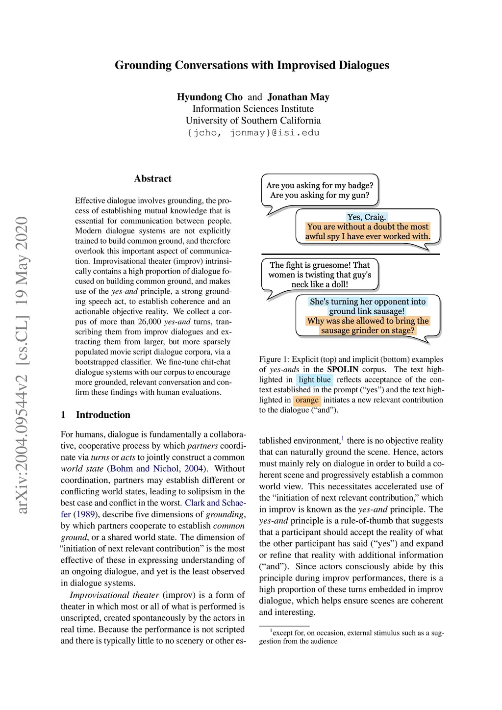 Effective dialogue involves grounding, the process of establishing mutual knowledge that is essential for communication between people. Modern dialogue systems are not explicitly trained to build common ground, and therefore overlook this important aspect of communication. Improvisational theater (improv) intrinsically contains a high proportion of dialogue focused on building common ground, and makes use of the yes-and principle, a strong grounding speech act, to establish coherence and an actionable objective reality. We collect a corpus of more than 26,000 yes-and turns, transcribing them from improv dialogues and extracting them from larger, but more sparsely populated movie script dialogue corpora, via a bootstrapped classifier. We fine-tune chit-chat dialogue systems with our corpus to encourage more grounded, relevant conversation and confirm these findings with human evaluations.