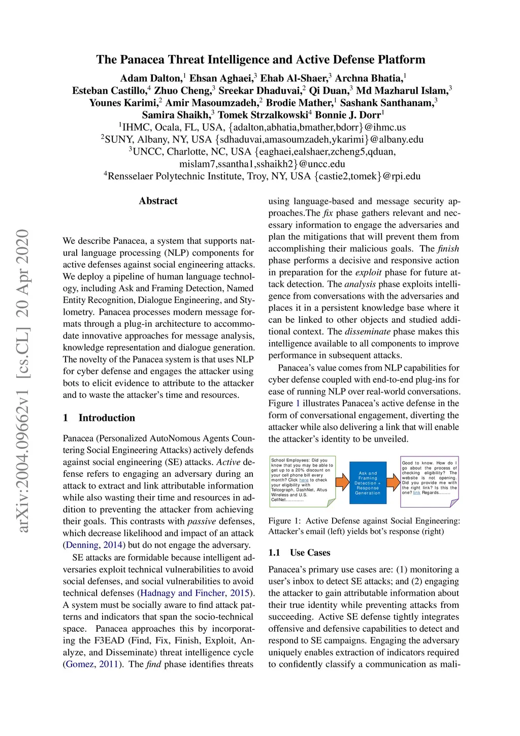 We describe Panacea, a system that supports natural language processing (NLP) components for active defenses against social engineering attacks. We deploy a pipeline of human language technology, including Ask and Framing Detection, Named Entity Recognition, Dialogue Engineering, and Stylometry. Panacea processes modern message formats through a plug-in architecture to accommodate innovative approaches for message analysis, knowledge representation and dialogue generation. The novelty of the Panacea system is that uses NLP for cyber defense and engages the attacker using bots to elicit evidence to attribute to the attacker and to waste the attacker's time and resources.