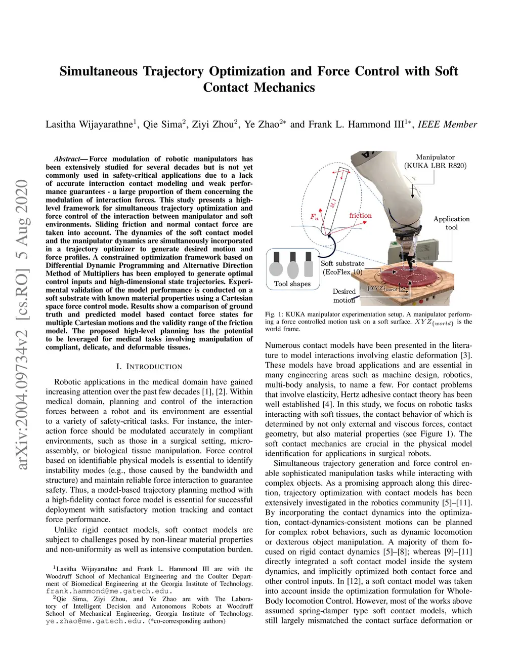 Force modulation of robotic manipulators has been extensively studied for several decades but is not yet commonly used in safety-critical applications due to a lack of accurate interaction contact modeling and weak performance guarantees - a large proportion of them concerning the modulation of interaction forces. This study presents a high-level framework for simultaneous trajectory optimization and force control of the interaction between manipulator and soft environments. Sliding friction and normal contact force are taken into account. The dynamics of the soft contact model and the manipulator dynamics are simultaneously incorporated in the trajectory optimizer to generate desired motion and force profiles. A constraint optimization framework based on Differential Dynamic Programming and Alternative Direction Method of Multipliers has been employed to generate optimal control input and high-dimensional state trajectories. Experimental validation of the model performance is conducted on a soft substrate with known material properties using Cartesian space force control mode. Results show a comparison of ground truth and predicted model based contact force states for a few cartesian motions and the validity range of the friction model. Potential applications include high-level task planning of medical tasks involving manipulation of compliant, delicate, and deformable tissues.