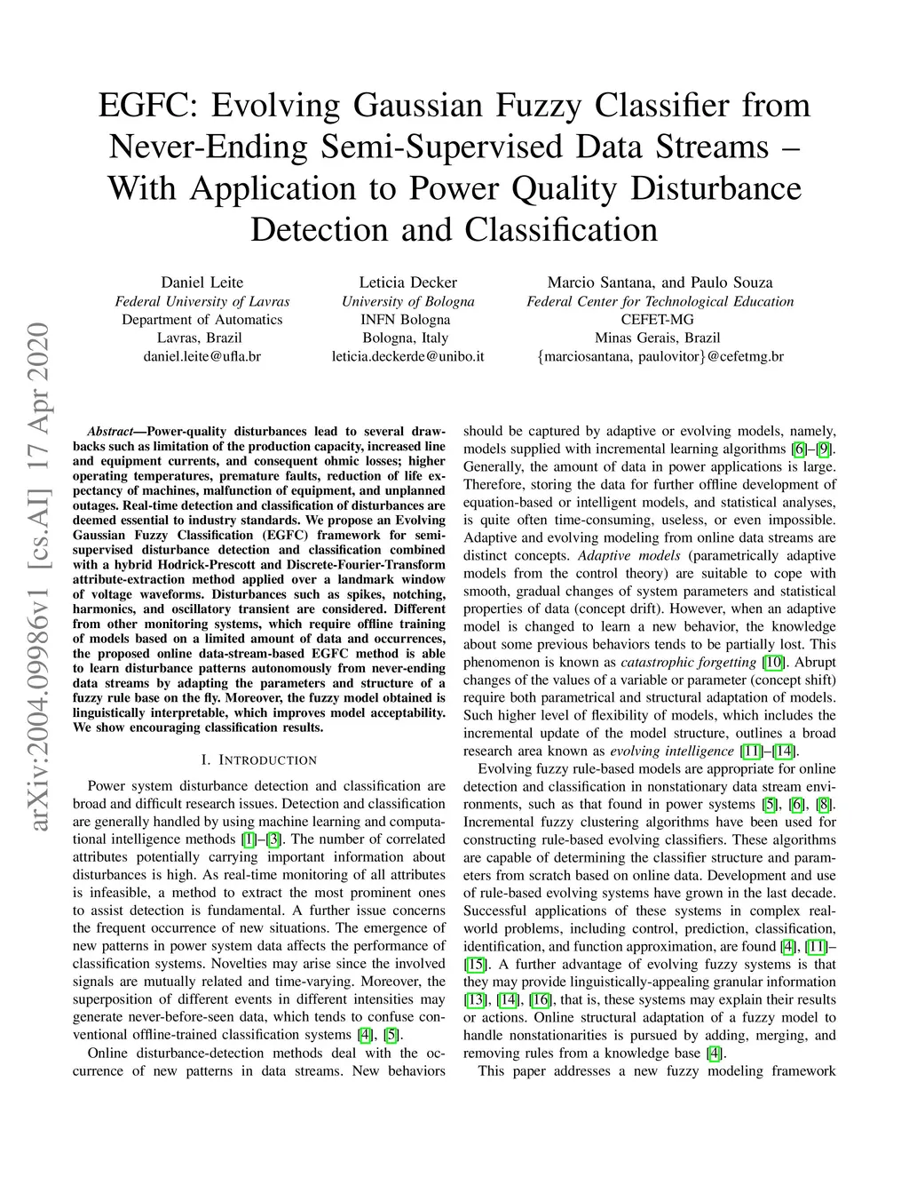Power-quality disturbances lead to several drawbacks such as limitation of the production capacity, increased line and equipment currents, and consequent ohmic losses; higher operating temperatures, premature faults, reduction of life expectancy of machines, malfunction of equipment, and unplanned outages. Real-time detection and classification of disturbances are deemed essential to industry standards. We propose an Evolving Gaussian Fuzzy Classification (EGFC) framework for semi-supervised disturbance detection and classification combined with a hybrid Hodrick-Prescott and Discrete-Fourier-Transform attribute-extraction method applied over a landmark window of voltage waveforms. Disturbances such as spikes, notching, harmonics, and oscillatory transient are considered. Different from other monitoring systems, which require offline training of models based on a limited amount of data and occurrences, the proposed online data-stream-based EGFC method is able to learn disturbance patterns autonomously from never-ending data streams by adapting the parameters and structure of a fuzzy rule base on the fly. Moreover, the fuzzy model obtained is linguistically interpretable, which improves model acceptability. We show encouraging classification results.