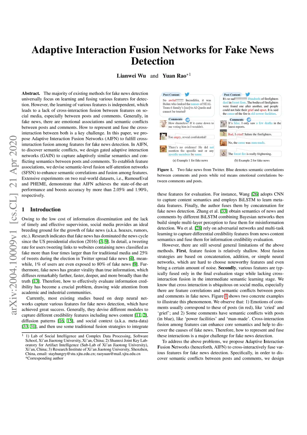 Adaptive Interaction Fusion Networks for Fake News Detection