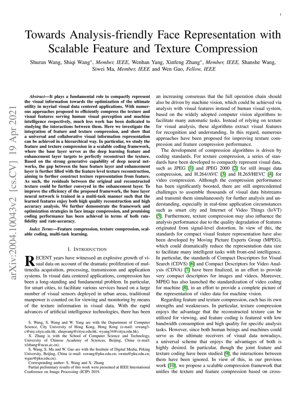It plays a fundamental role to compactly represent the visual information towards the optimization of the ultimate utility in myriad visual data centered applications. With numerous approaches proposed to efficiently compress the texture and visual features serving human visual perception and machine intelligence respectively, much less work has been dedicated to studying the interactions between them. Here we investigate the integration of feature and texture compression, and show that a universal and collaborative visual information representation can be achieved in a hierarchical way. In particular, we study the feature and texture compression in a scalable coding framework, where the base layer serves as the deep learning feature and enhancement layer targets to perfectly reconstruct the texture. Based on the strong generative capability of deep neural networks, the gap between the base feature layer and enhancement layer is further filled with the feature level texture reconstruction, aiming to further construct texture representation from feature. As such, the residuals between the original and reconstructed texture could be further conveyed in the enhancement layer. To improve the efficiency of the proposed framework, the base layer neural network is trained in a multi-task manner such that the learned features enjoy both high quality reconstruction and high accuracy analysis. We further demonstrate the framework and optimization strategies in face image compression, and promising coding performance has been achieved in terms of both rate-fidelity and rate-accuracy.