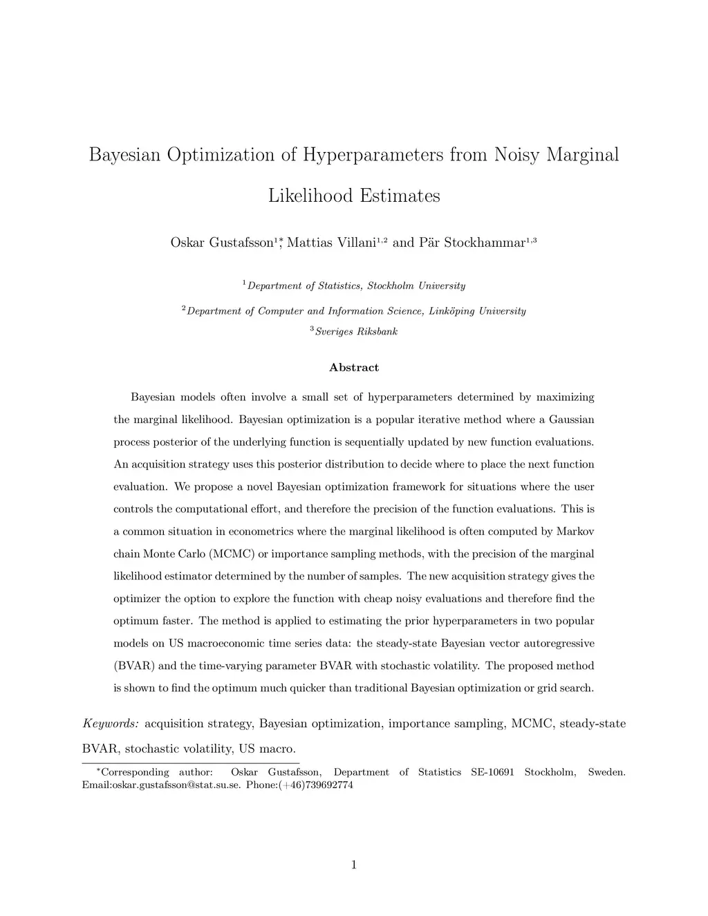 Bayesian models often involve a small set of hyperparameters determined by maximizing the marginal likelihood. Bayesian optimization is a popular iterative method where a Gaussian process posterior of the underlying function is sequentially updated by new function evaluations. An acquisition strategy uses this posterior distribution to decide where to place the next function evaluation. We propose a novel Bayesian optimization framework for situations where the user controls the computational effort, and therefore the precision of the function evaluations. This is a common situation in econometrics where the marginal likelihood is often computed by Markov chain Monte Carlo (MCMC) or importance sampling methods, with the precision of the marginal likelihood estimator determined by the number of samples. The new acquisition strategy gives the optimizer the option to explore the function with cheap noisy evaluations and therefore find the optimum faster. The method is applied to estimating the prior hyperparameters in two popular models on US macroeconomic time series data: the steady-state Bayesian vector autoregressive (BVAR) and the time-varying parameter BVAR with stochastic volatility. The proposed method is shown to find the optimum much quicker than traditional Bayesian optimization or grid search.