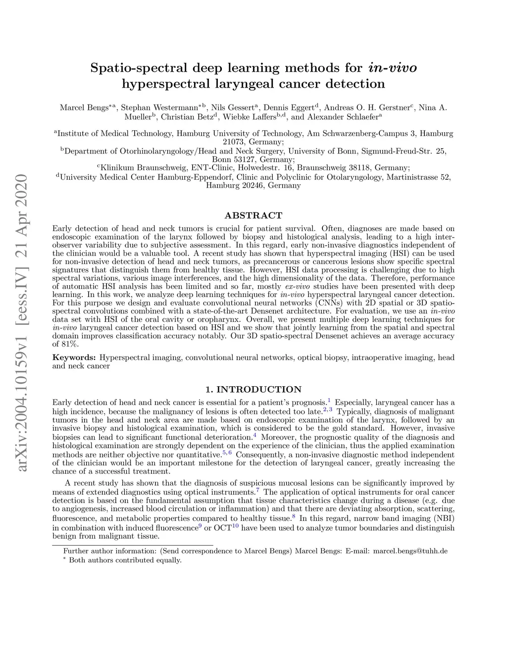 Early detection of head and neck tumors is crucial for patient survival. Often, diagnoses are made based on endoscopic examination of the larynx followed by biopsy and histological analysis, leading to a high inter-observer variability due to subjective assessment. In this regard, early non-invasive diagnostics independent of the clinician would be a valuable tool. A recent study has shown that hyperspectral imaging (HSI) can be used for non-invasive detection of head and neck tumors, as precancerous or cancerous lesions show specific spectral signatures that distinguish them from healthy tissue. However, HSI data processing is challenging due to high spectral variations, various image interferences, and the high dimensionality of the data. Therefore, performance of automatic HSI analysis has been limited and so far, mostly ex-vivo studies have been presented with deep learning. In this work, we analyze deep learning techniques for in-vivo hyperspectral laryngeal cancer detection. For this purpose we design and evaluate convolutional neural networks (CNNs) with 2D spatial or 3D spatio-spectral convolutions combined with a state-of-the-art Densenet architecture. For evaluation, we use an in-vivo data set with HSI of the oral cavity or oropharynx. Overall, we present multiple deep learning techniques for in-vivo laryngeal cancer detection based on HSI and we show that jointly learning from the spatial and spectral domain improves classification accuracy notably. Our 3D spatio-spectral Densenet achieves an average accuracy of 81%.