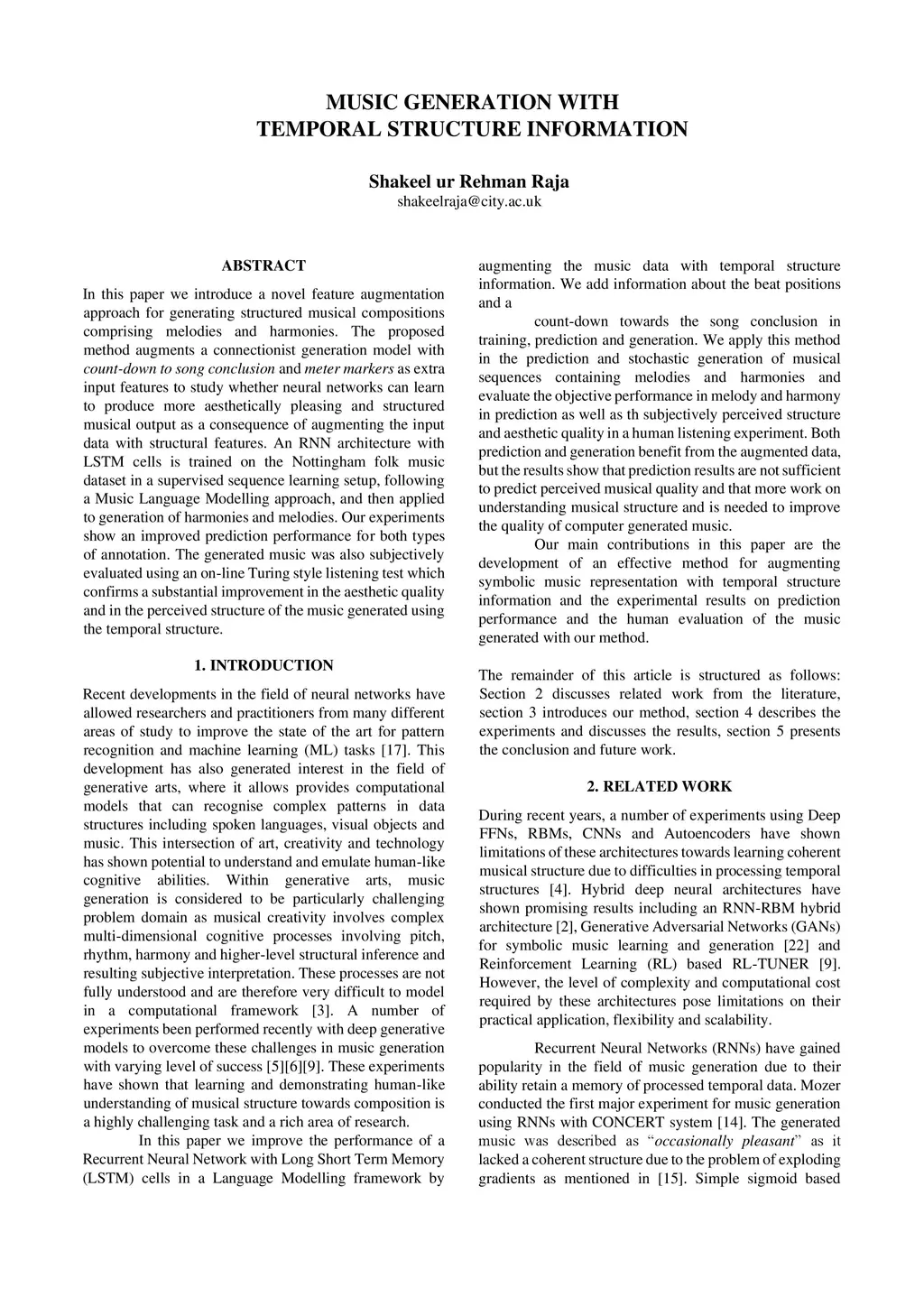 In this paper we introduce a novel feature augmentation approach for generating structured musical compositions comprising melodies and harmonies. The proposed method augments a connectionist generation model with count-down to song conclusion and meter markers as extra input features to study whether neural networks can learn to produce more aesthetically pleasing and structured musical output as a consequence of augmenting the input data with structural features. An RNN architecture with LSTM cells is trained on the Nottingham folk music dataset in a supervised sequence learning setup, following a Music Language Modelling approach, and then applied to generation of harmonies and melodies. Our experiments show an improved prediction performance for both types of annotation. The generated music was also subjectively evaluated using an on-line Turing style listening test which confirms a substantial improvement in the aesthetic quality and in the perceived structure of the music generated using the temporal structure.