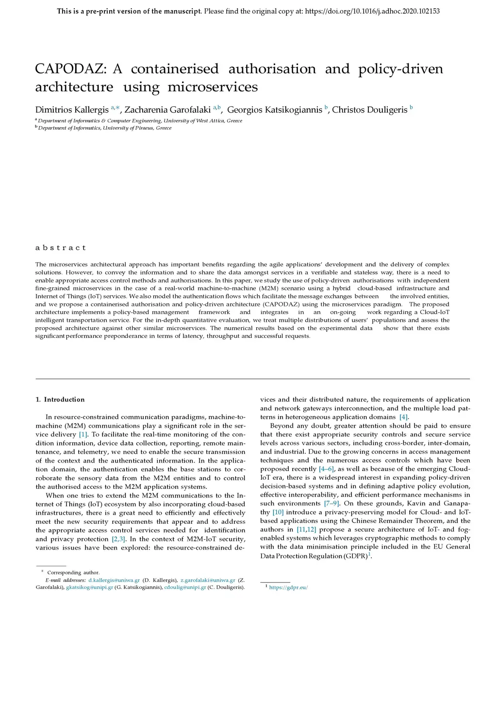 The microservices architectural approach has important benefits regarding the agile applications' development and the delivery of complex solutions. However, to convey the information and share the data amongst services in a verifiable and stateless way, there is a need to enable appropriate access control methods and authorisations. In this paper, we study the use of policy-driven authorisations with independent fine-grained microservices in the case of a real-world machine-to-machine (M2M) scenario using a hybrid cloud-based infrastructure and Internet of Things (IoT) services. We also model the authentication flows which facilitate the message exchanges between the involved entities, and we propose a containerised authorisation and policy-driven architecture (CAPODAZ) using the microservices paradigm. The proposed architecture implements a policy-based management framework and integrates in an on-going work regarding a Cloud-IoT intelligent transportation service. For the in-depth quantitative evaluation, we treat multiple distributions of users' populations and assess the proposed architecture against other similar microservices. The numerical results based on the experimental data show that there exists significant performance preponderance in terms of latency, throughput and successful requests.