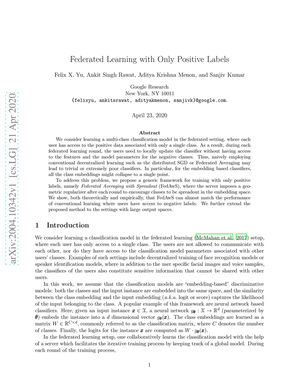 We consider learning a multi-class classification model in the federated setting, where each user has access to the positive data associated with only a single class. As a result, during each federated learning round, the users need to locally update the classifier without having access to the features and the model parameters for the negative classes. Thus, naively employing conventional decentralized learning such as the distributed SGD or Federated Averaging may lead to trivial or extremely poor classifiers. In particular, for the embedding based classifiers, all the class embeddings might collapse to a single point. To address this problem, we propose a generic framework for training with only positive labels, namely Federated Averaging with Spreadout (FedAwS), where the server imposes a geometric regularizer after each round to encourage classes to be spreadout in the embedding space. We show, both theoretically and empirically, that FedAwS can almost match the performance of conventional learning where users have access to negative labels. We further extend the proposed method to the settings with large output spaces.