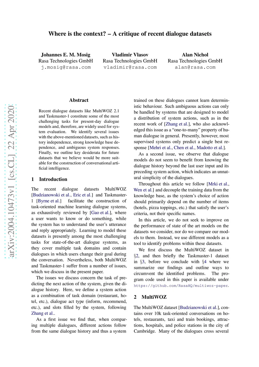 Where is the context? -- A critique of recent dialogue datasets