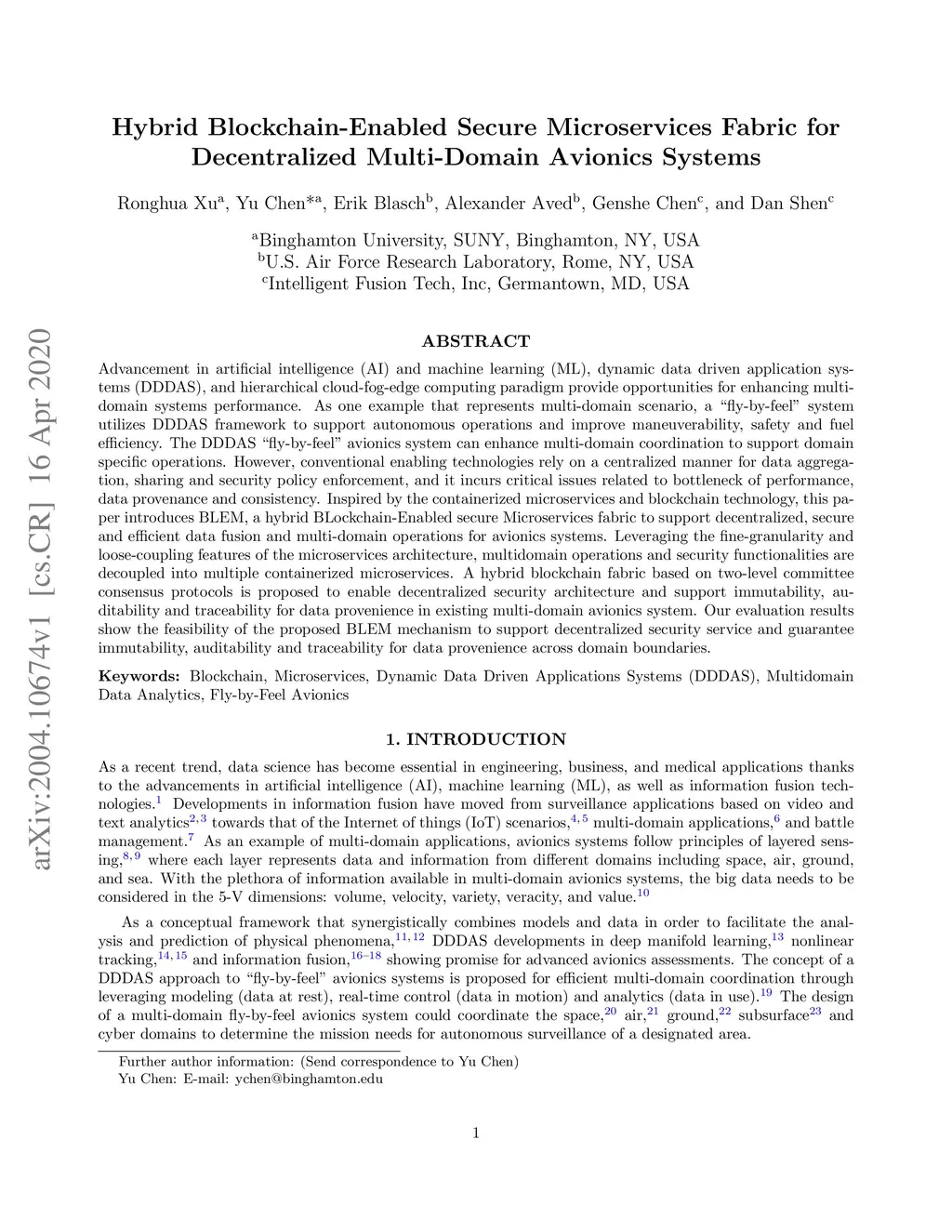Advancement in artificial intelligence (AI) and machine learning (ML), dynamic data driven application systems (DDDAS), and hierarchical cloud-fog-edge computing paradigm provide opportunities for enhancing multi-domain systems performance. As one example that represents multi-domain scenario, a "fly-by-feel" system utilizes DDDAS framework to support autonomous operations and improve maneuverability, safety and fuel efficiency. The DDDAS "fly-by-feel" avionics system can enhance multi-domain coordination to support domain specific operations. However, conventional enabling technologies rely on a centralized manner for data aggregation, sharing and security policy enforcement, and it incurs critical issues related to bottleneck of performance, data provenance and consistency. Inspired by the containerized microservices and blockchain technology, this paper introduces BLEM, a hybrid BLockchain-Enabled secure Microservices fabric to support decentralized, secure and efficient data fusion and multi-domain operations for avionics systems. Leveraging the fine-granularity and loose-coupling features of the microservices architecture, multidomain operations and security functionalities are decoupled into multiple containerized microservices. A hybrid blockchain fabric based on two-level committee consensus protocols is proposed to enable decentralized security architecture and support immutability, auditability and traceability for data provenience in existing multi-domain avionics system. Our evaluation results show the feasibility of the proposed BLEM mechanism to support decentralized security service and guarantee immutability, auditability and traceability for data provenience across domain boundaries.