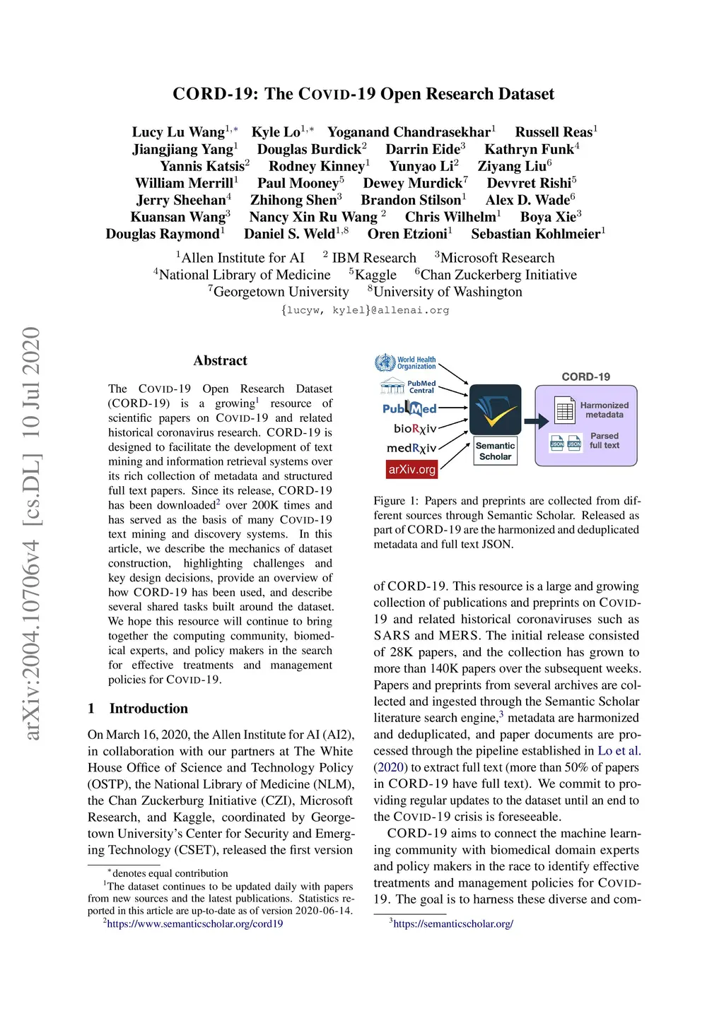 The COVID-19 Open Research Dataset (CORD-19) is a growing resource of scientific papers on COVID-19 and related historical coronavirus research. CORD-19 is designed to facilitate the development of text mining and information retrieval systems over its rich collection of metadata and structured full text papers. Since its release, CORD-19 has been downloaded over 200K times and has served as the basis of many COVID-19 text mining and discovery systems. In this article, we describe the mechanics of dataset construction, highlighting challenges and key design decisions, provide an overview of how CORD-19 has been used, and describe several shared tasks built around the dataset. We hope this resource will continue to bring together the computing community, biomedical experts, and policy makers in the search for effective treatments and management policies for COVID-19.
