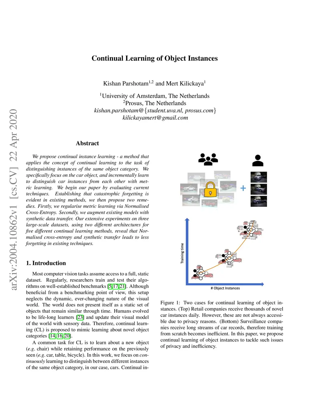 We propose continual instance learning - a method that applies the concept of continual learning to the task of distinguishing instances of the same object category. We specifically focus on the car object, and incrementally learn to distinguish car instances from each other with metric learning. We begin our paper by evaluating current techniques. Establishing that catastrophic forgetting is evident in existing methods, we then propose two remedies. Firstly, we regularise metric learning via Normalised Cross-Entropy. Secondly, we augment existing models with synthetic data transfer. Our extensive experiments on three large-scale datasets, using two different architectures for five different continual learning methods, reveal that Normalised cross-entropy and synthetic transfer leads to less forgetting in existing techniques.
