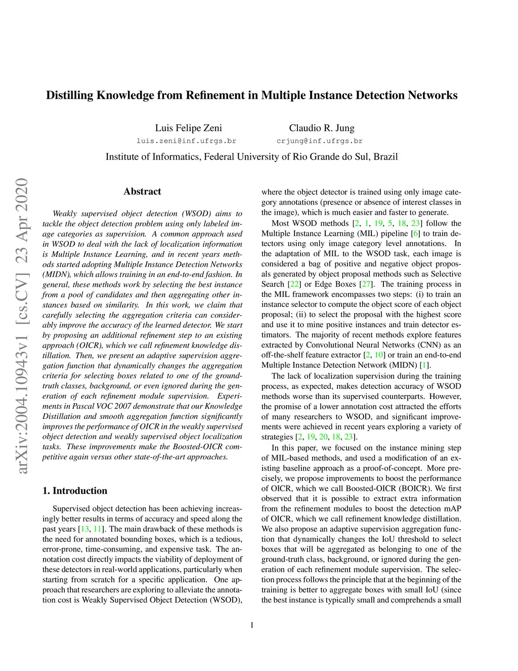 Weakly supervised object detection (WSOD) aims to tackle the object detection problem using only labeled image categories as supervision. A common approach used in WSOD to deal with the lack of localization information is Multiple Instance Learning, and in recent years methods started adopting Multiple Instance Detection Networks (MIDN), which allows training in an end-to-end fashion. In general, these methods work by selecting the best instance from a pool of candidates and then aggregating other instances based on similarity. In this work, we claim that carefully selecting the aggregation criteria can considerably improve the accuracy of the learned detector. We start by proposing an additional refinement step to an existing approach (OICR), which we call refinement knowledge distillation. Then, we present an adaptive supervision aggregation function that dynamically changes the aggregation criteria for selecting boxes related to one of the ground-truth classes, background, or even ignored during the generation of each refinement module supervision. Experiments in Pascal VOC 2007 demonstrate that our Knowledge Distillation and smooth aggregation function significantly improves the performance of OICR in the weakly supervised object detection and weakly supervised object localization tasks. These improvements make the Boosted-OICR competitive again versus other state-of-the-art approaches.